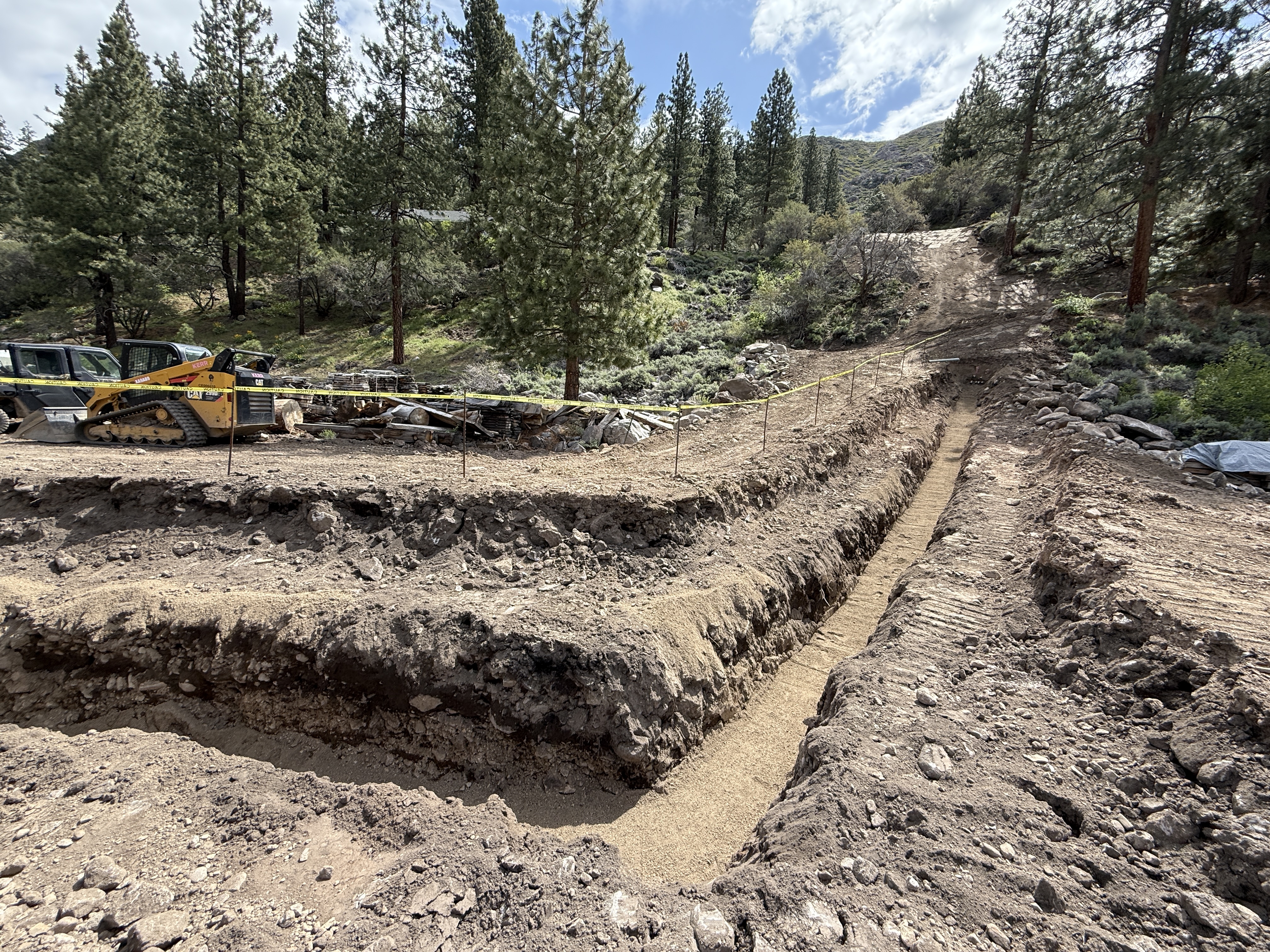 The image shows a long trench that has been excavated in a forested area. There is a skid steer loader visible on the left side of the image, parked near the open trench. Caution tape is strung along the trench's length, indicating a controlled area. The trench is partially filled with a layer of sand or fine soil. Trees surround the worksite, and the weather appears clear.