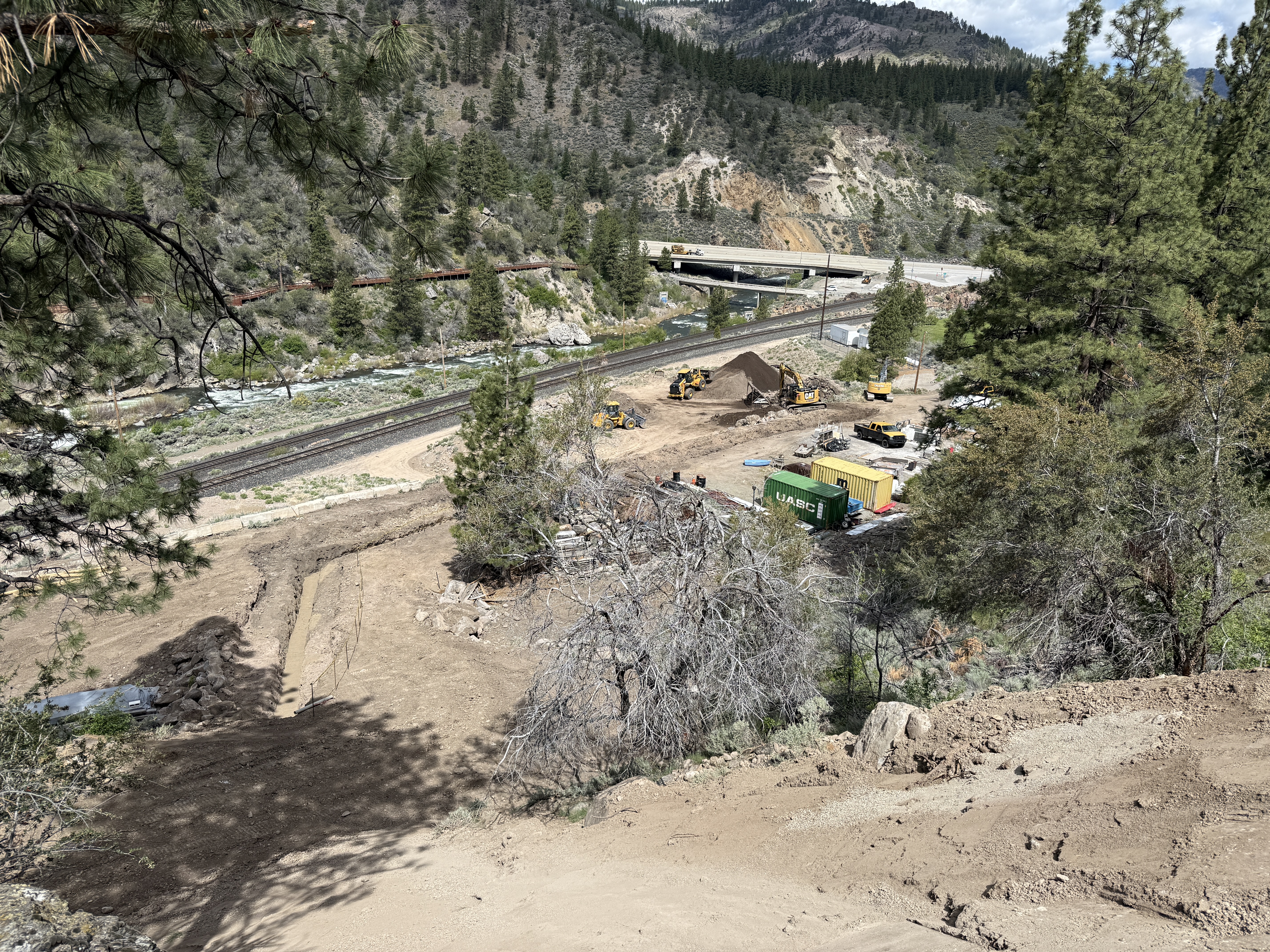 graded soil area with mixed vegetation partly cloudy daylight mostly open with some equipment staging areas