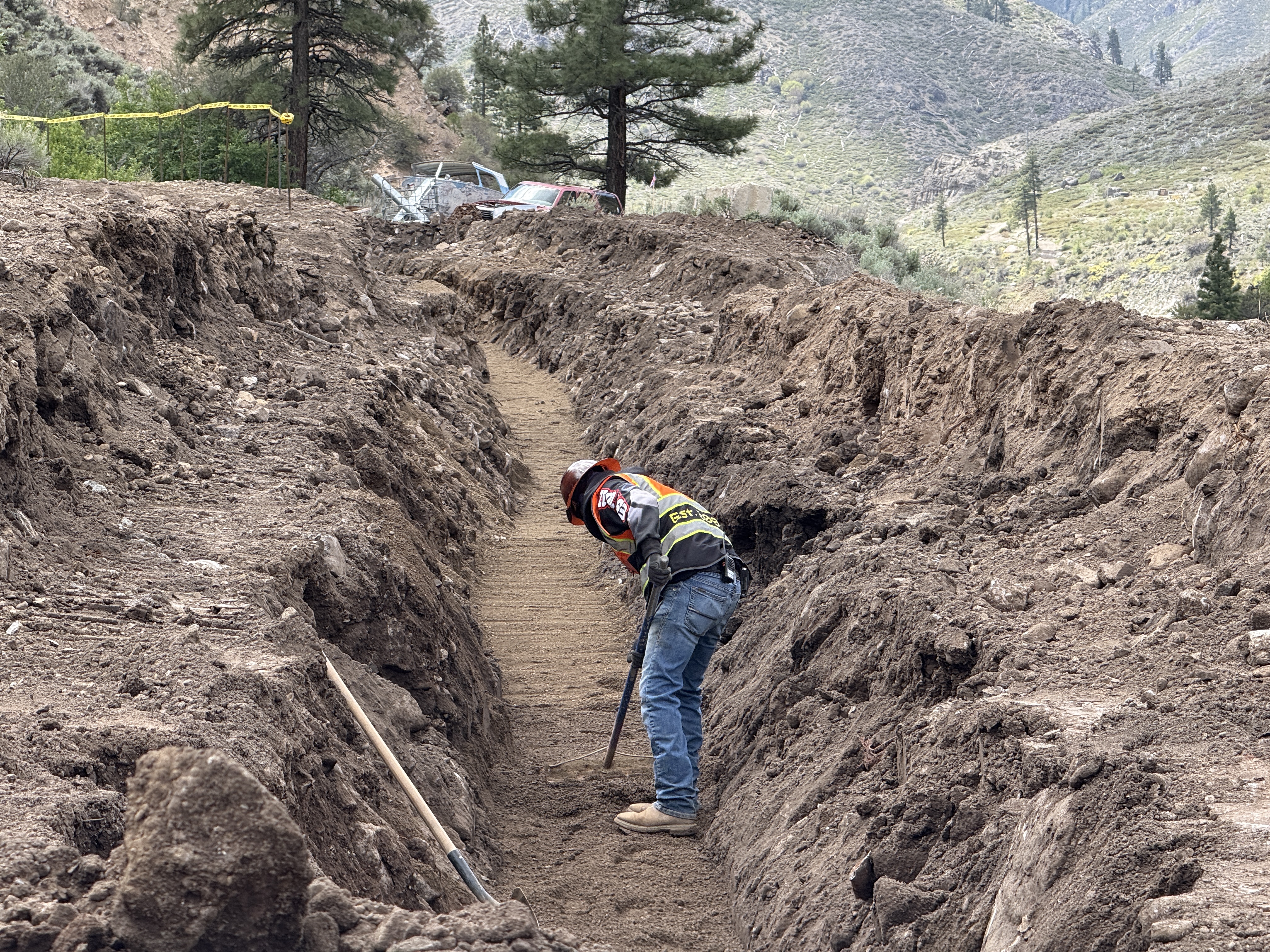 The image shows a worker wearing PPE in a trench at a construction site. The trench is filled with soil, and the worker is using a shovel or similar tool to perform trenching activities. The surrounding area is rural with hills and trees visible in the background. Caution tape is present near the trench, indicating safety measures.