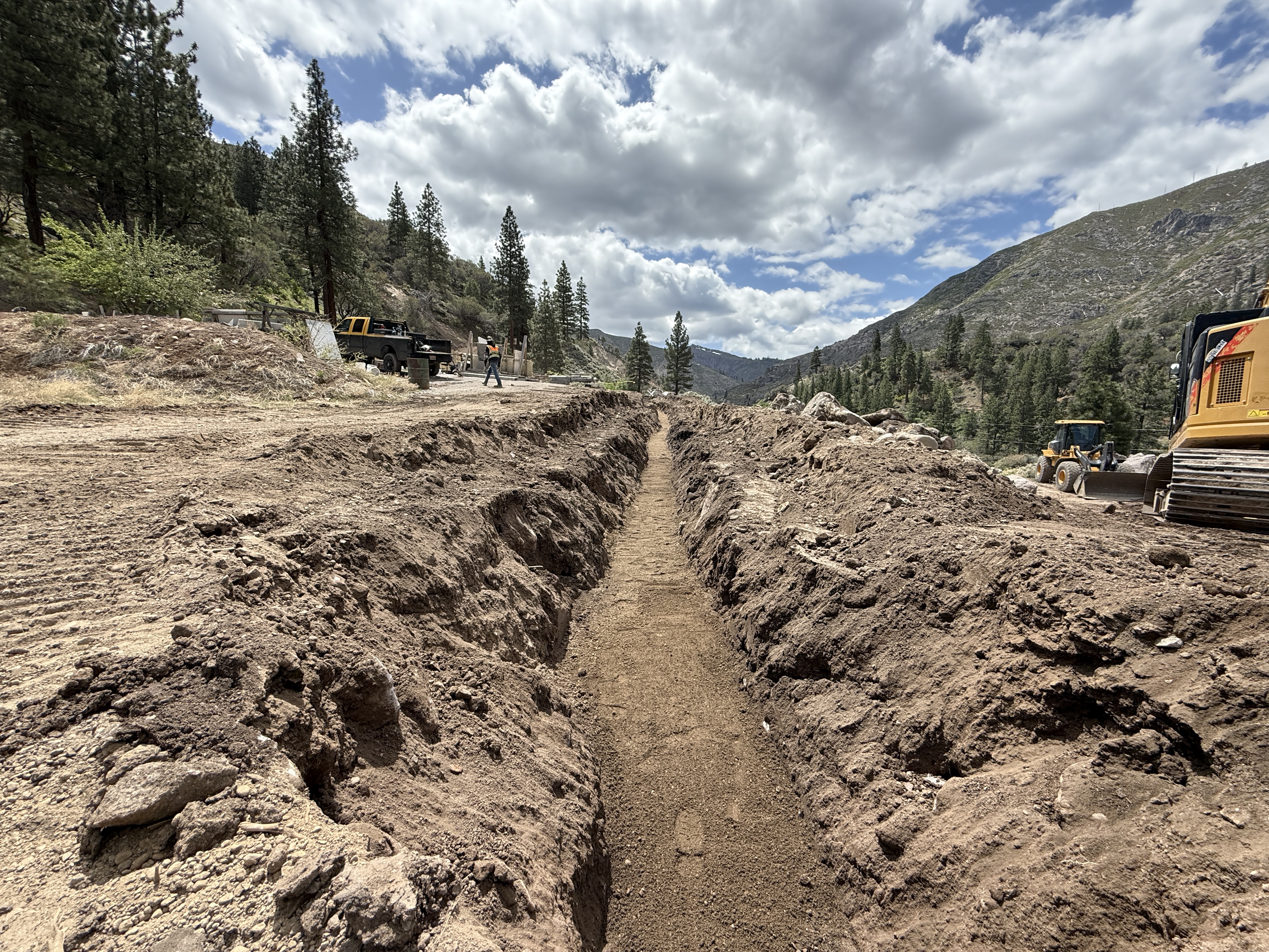 The image depicts an ongoing trenching operation with a long trench dug into a dirt area. A construction vehicle and heavy machinery, including an excavator and a bulldozer, are visible near the trench. A worker is seen walking beside a parked utility vehicle. The surroundings include a rural landscape with trees and mountains.