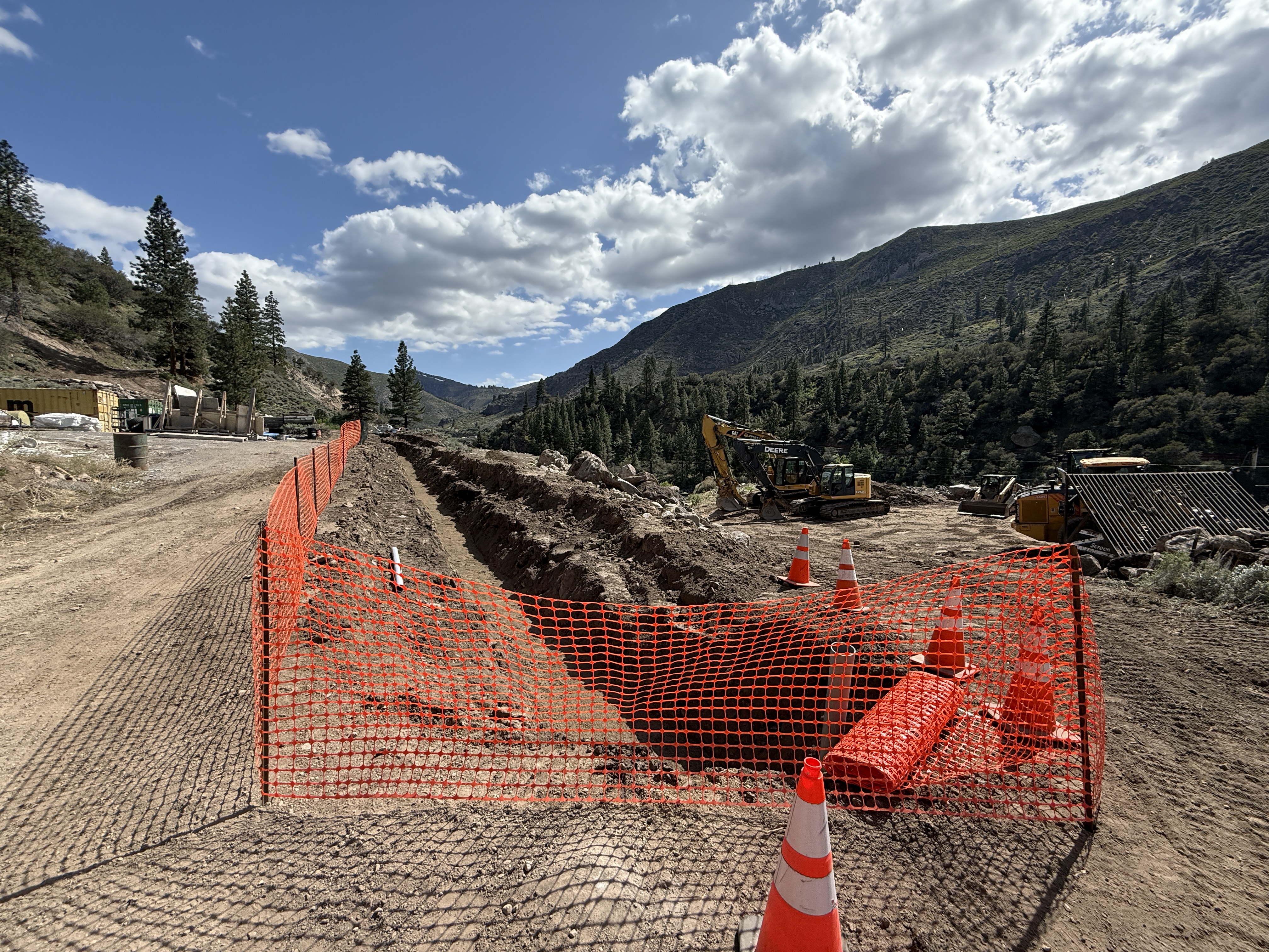 The image shows an active trenching area with a long, open trench running along the side of a dirt road. An excavator is parked near the trench, and orange safety fencing and cones are present to indicate the work area and ensure safety. The site is located in a mountainous region with trees and hills visible in the background. The trench appears to be unoccupied at the moment.