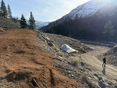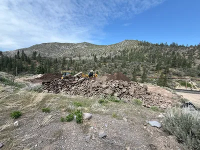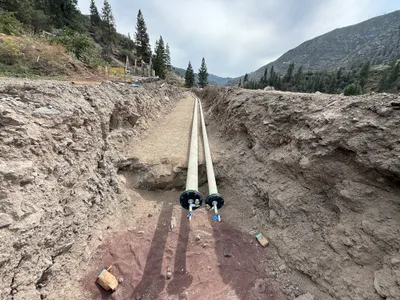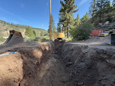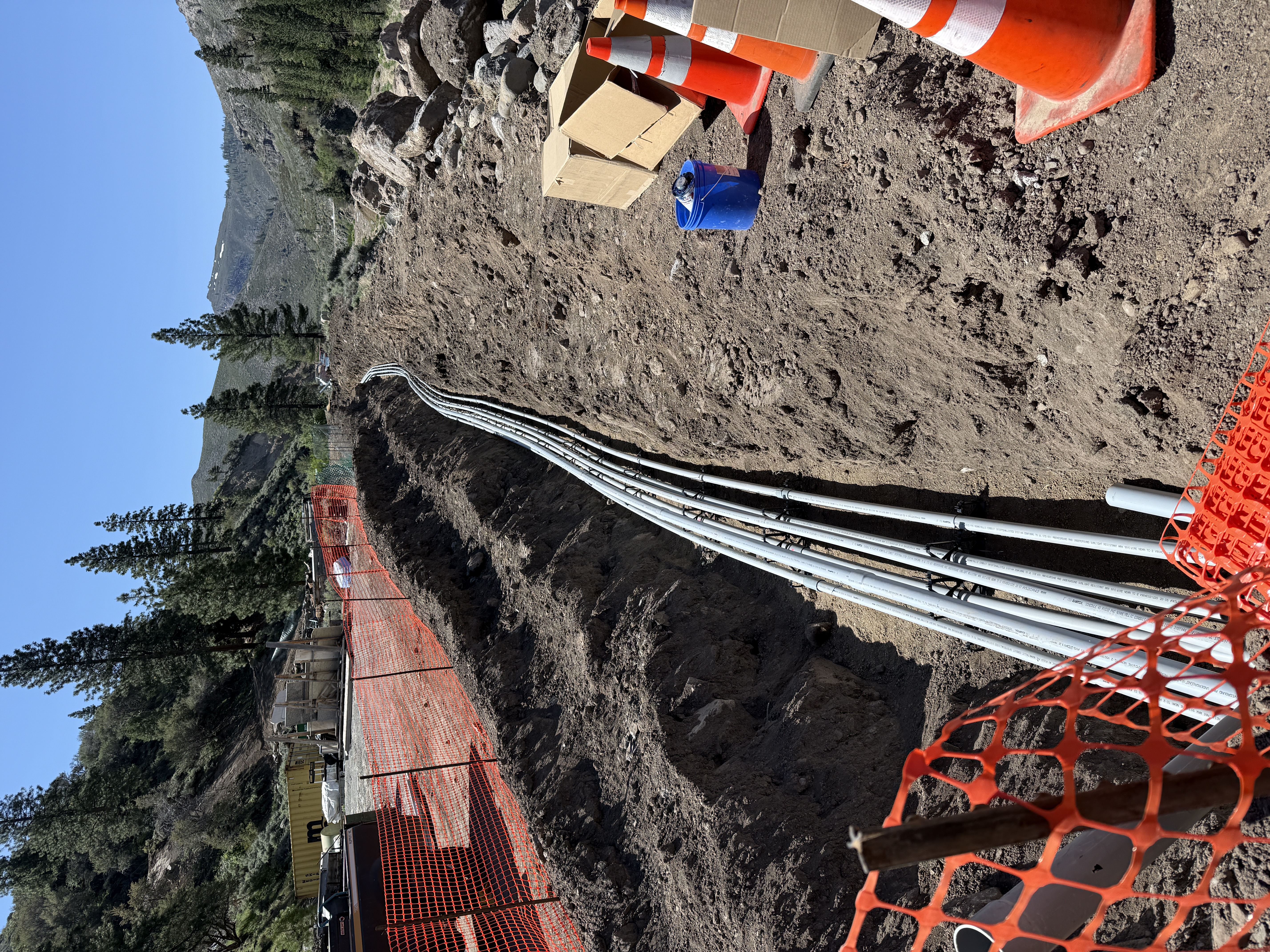 The image shows a trench with several conduits installed in an outdoor, rural area. The trench is lined with multiple aligned conduits, suggesting ongoing trenching work possibly related to utility installation. Orange safety fencing and traffic cones are visible, indicating demarcation of the work area. No heavy equipment or vehicles are seen, and the scene is well-lit under clear weather conditions.