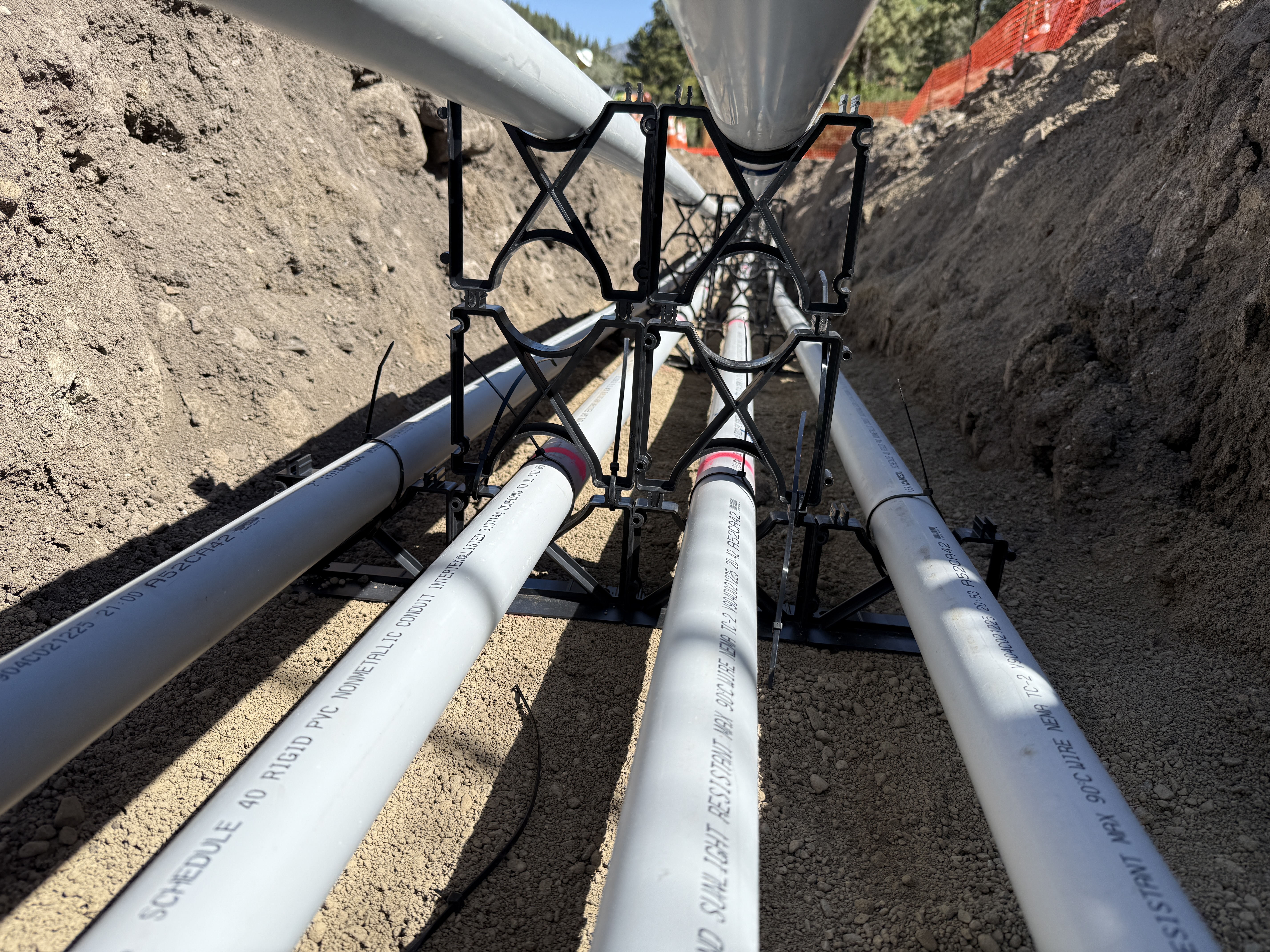 The image shows several PVC conduits laid parallel within a trench, supported by black racks or spacers. The conduits are aligned and positioned in groups of three to four. The trench seems recently excavated with loose soil piled on the sides. There is evidence of ongoing conduit installation work.