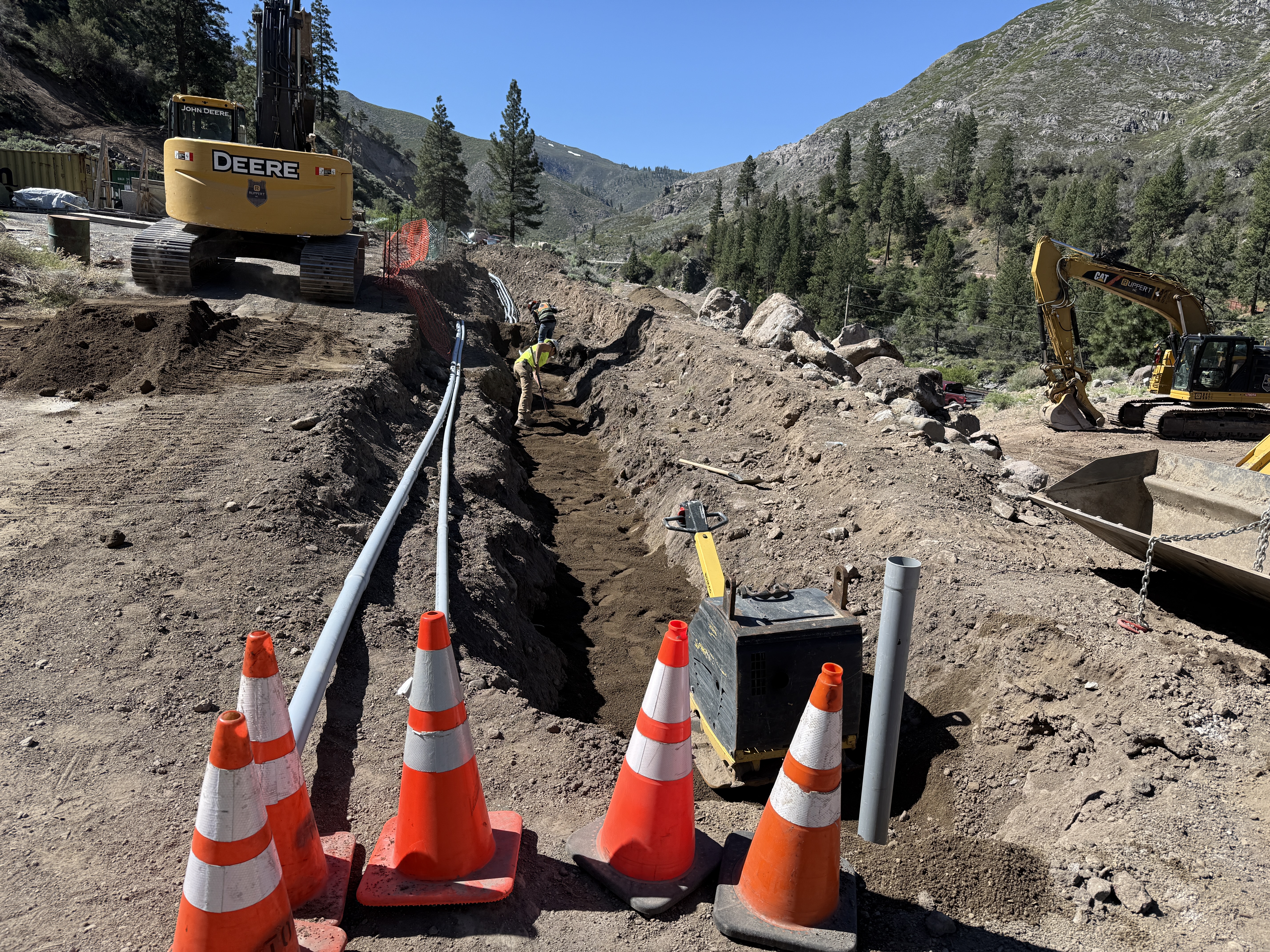 The image shows an open trench with piping being laid down. Heavy machinery including excavators are positioned near the trench. Workers in protective gear are visible inside the trench. Safety cones line the edge of the trench, indicating controlled access. The surrounding area includes rocky terrain and some vegetation.