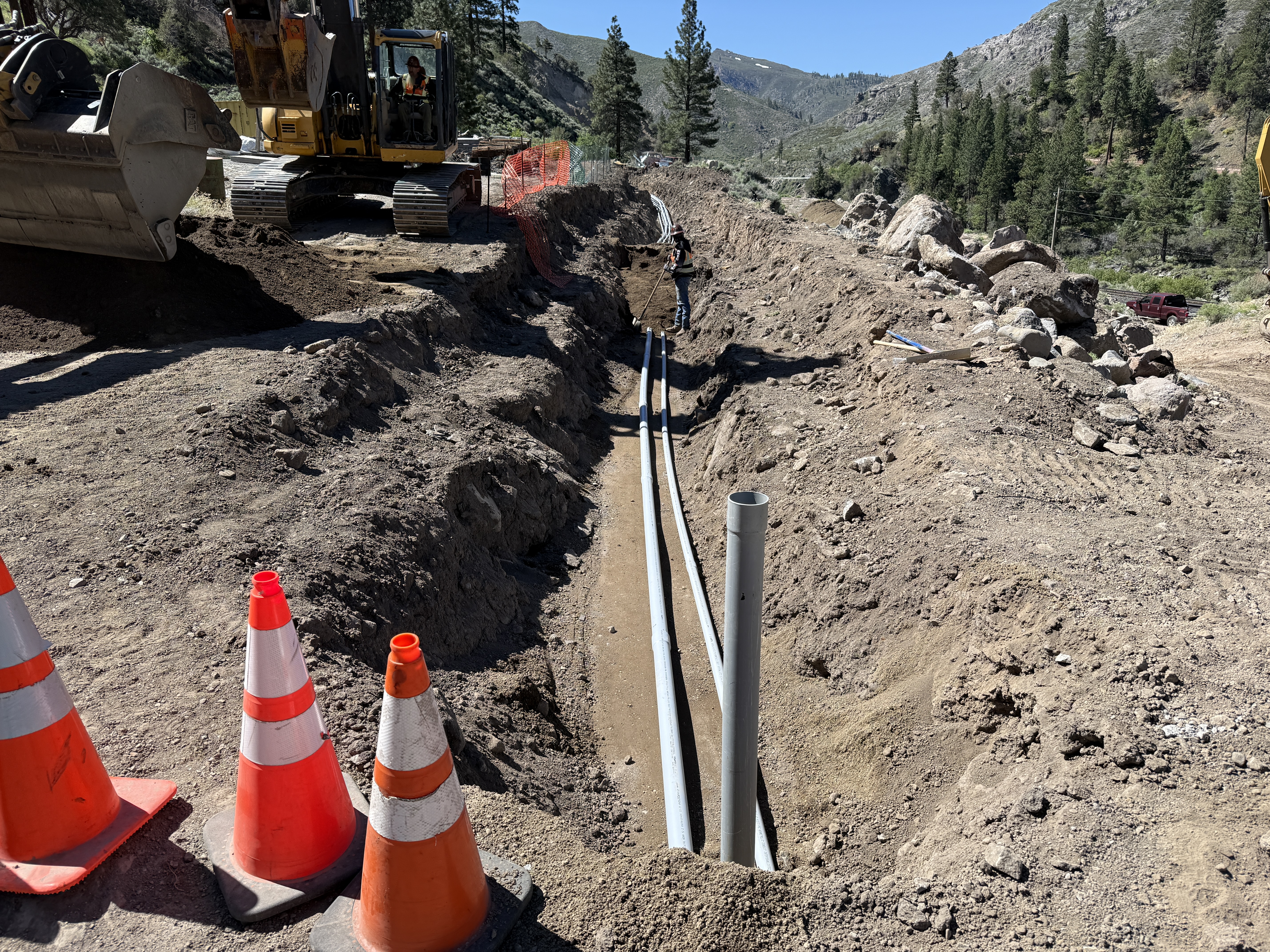 The image shows a trenching operation with multiple conduits being laid in a trench. An excavator is positioned to the left, and safety cones are placed nearby. The trench is situated in a mountainous area, suggesting remote work conditions. A worker is visible inside the trench, and erosion control fencing is present along one side.