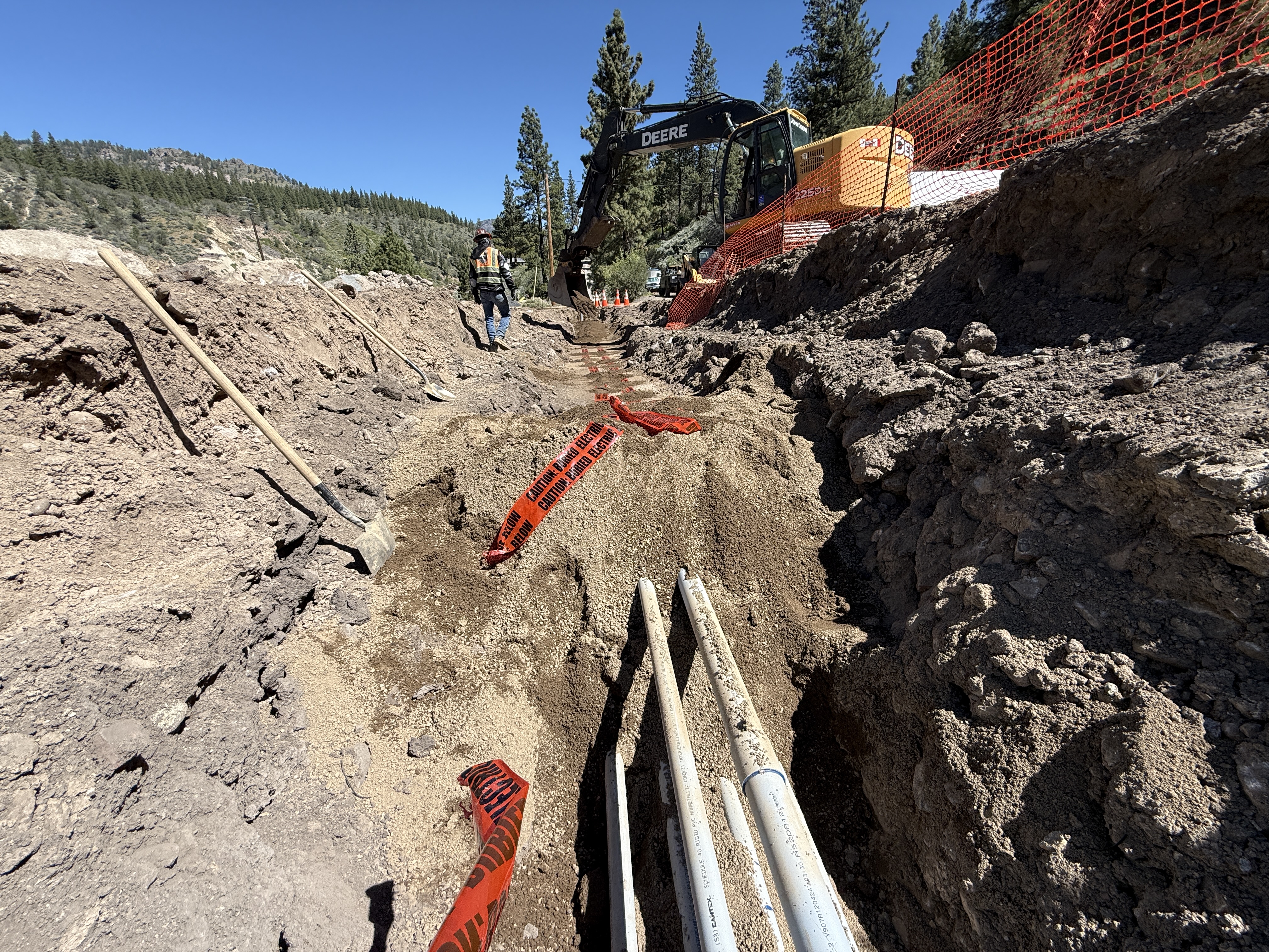 The image features an open trench with several conduits running along its length. There is caution tape placed above the conduits indicating potential hazards. A person in PPE is seen walking near the trench, and an excavator is positioned adjacent to the trench, indicating active trenching. The environment appears to be outdoors in a hilly, forested area.