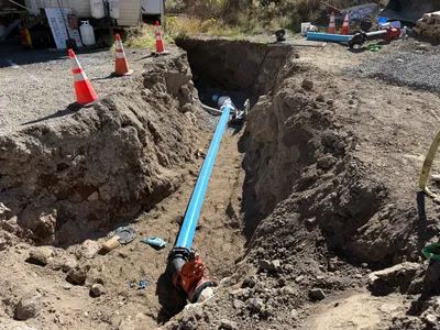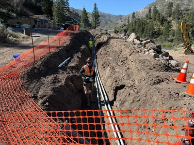 Traffic cones are visible, marking the trench area, but no other specific PPE is visible in the frame.