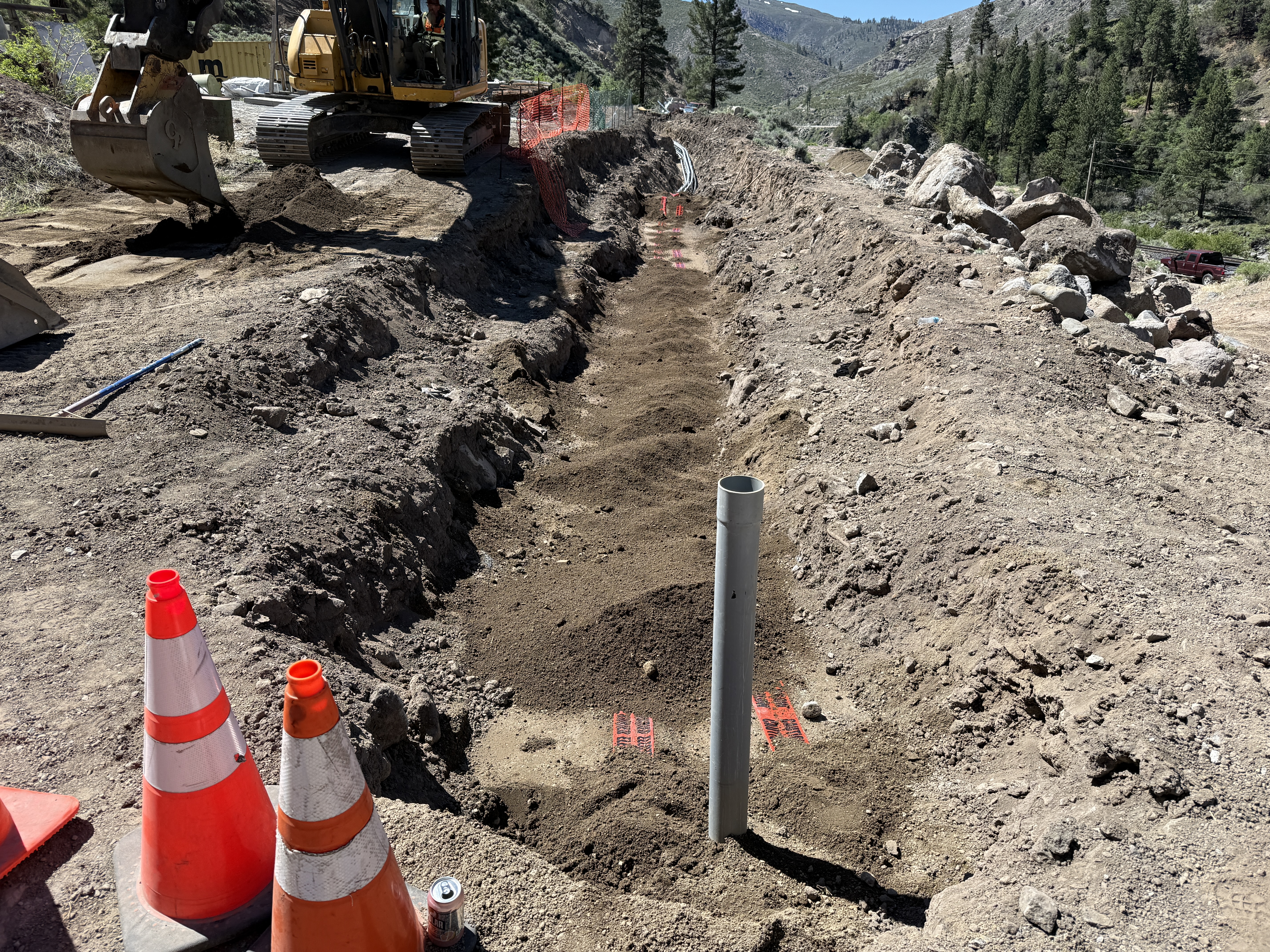 The image shows an open trench with surrounding heaps of excavated soil and an excavator positioned at the left side, actively moving soil. A standing pipe is visible within the trench, and several traffic cones are placed along the perimeter, indicating a safety buffer. The site appears to be in a mountainous area with clear, sunny weather.