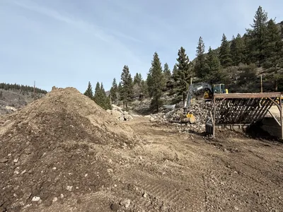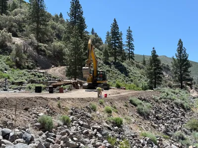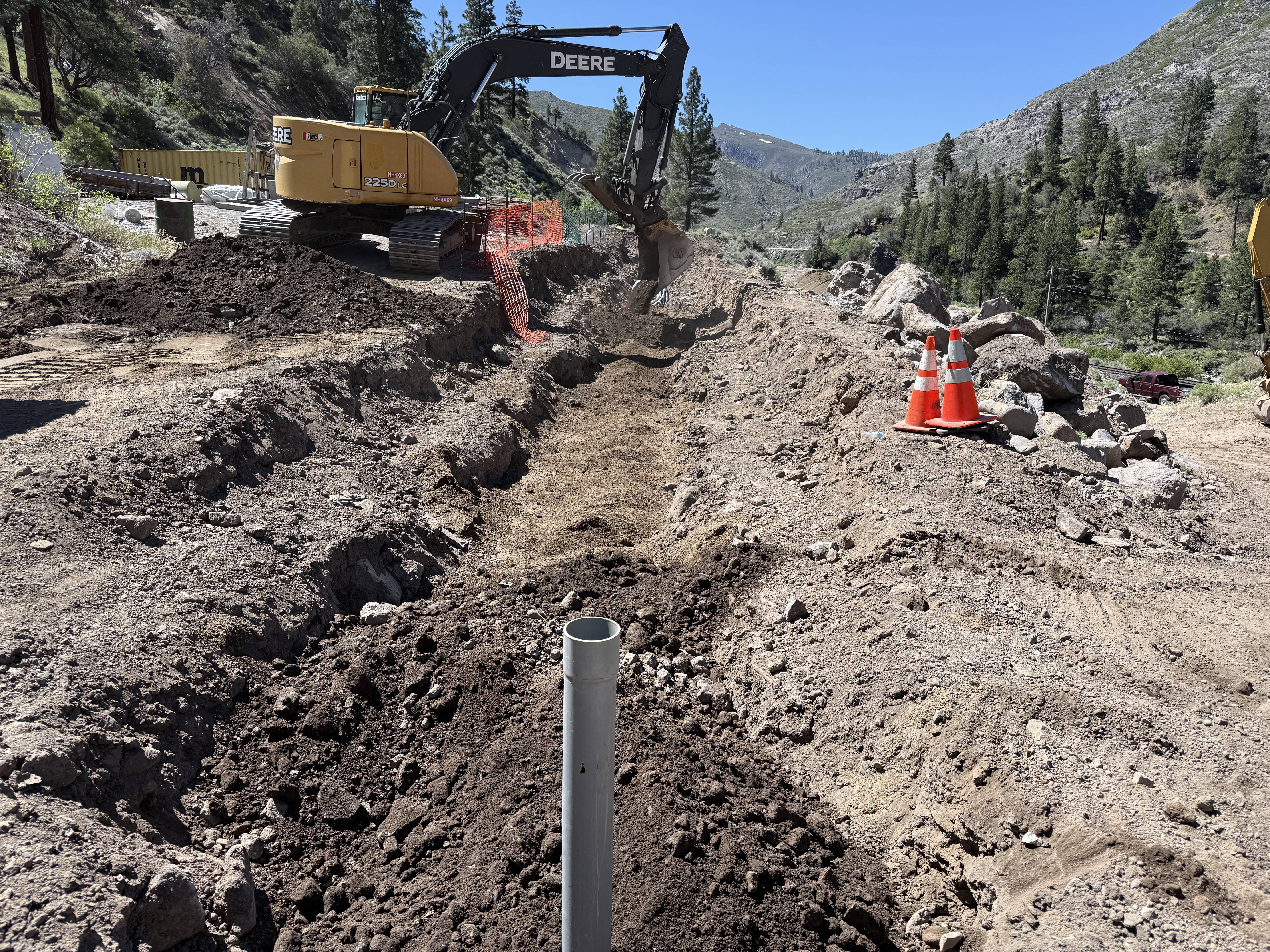 The image depicts an active trenching operation with an excavator in use on a dirt road. The trench is visible running along the length of the image from foreground to background. Traffic cones are positioned on the right side next to the trench. The setting is an outdoor site with mountainous terrain and clear weather.
