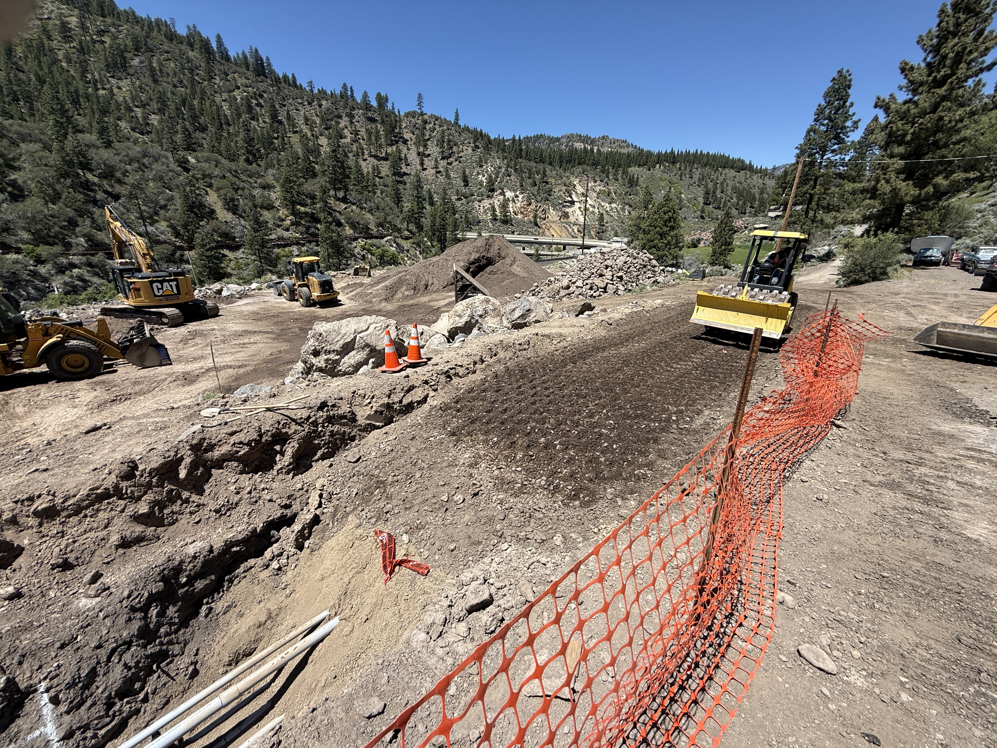 The image shows ongoing site grading with heavy equipment actively leveling and moving soil. Excavators are positioned on the left while compactors work along prepared soil paths. Red safety fencing and cones are used to demarcate the work area. Loose soil piles can be seen in the middle ground, indicating recent excavation or grading work.