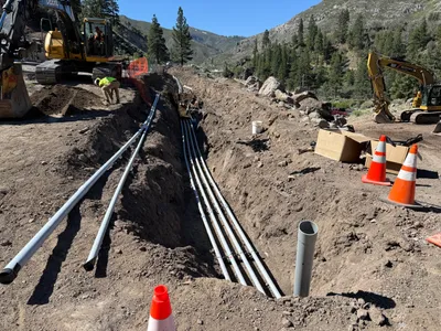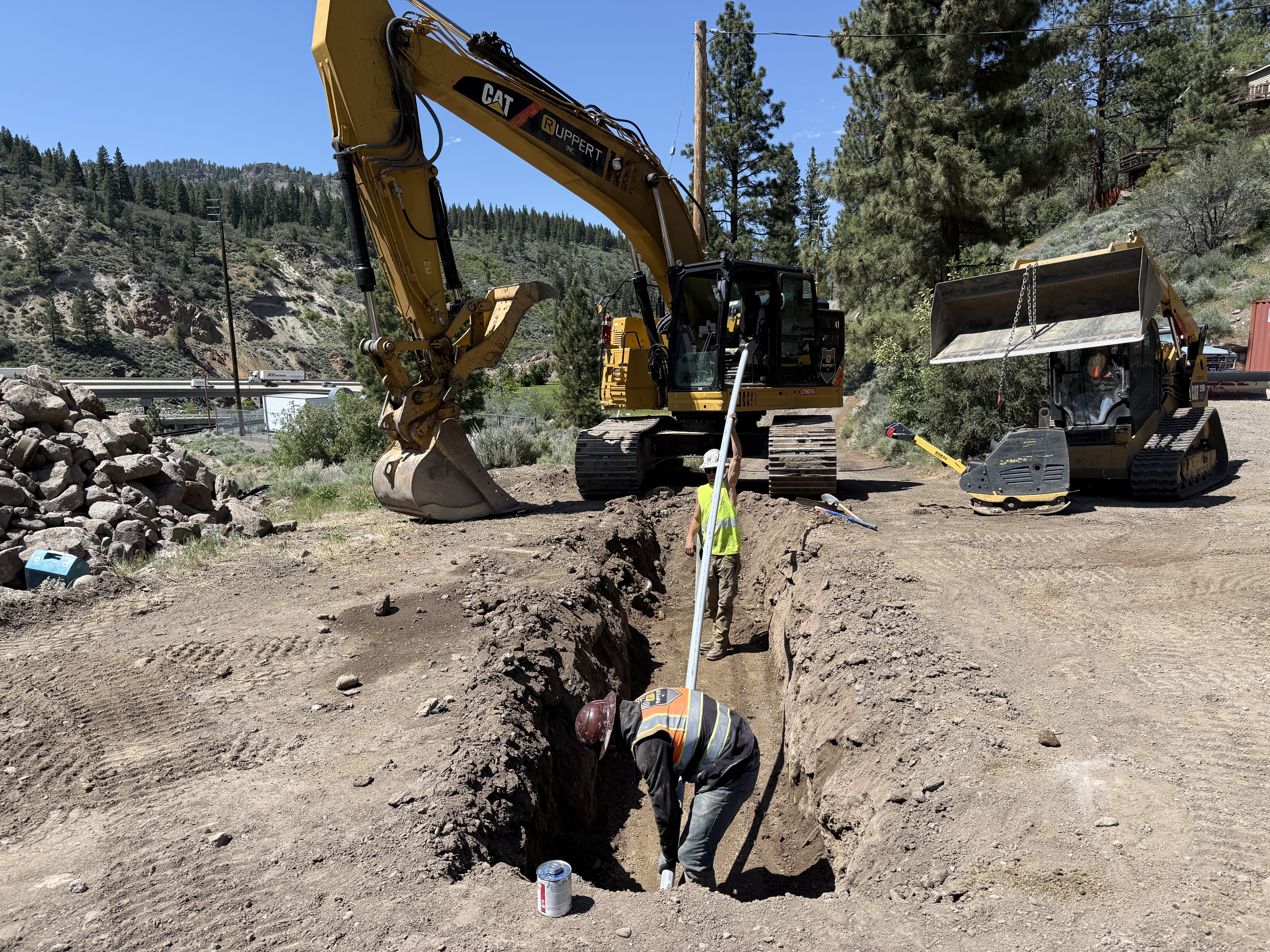 The image shows workers inside and beside a trench installing a pipe. An excavator is positioned next to the trench, and a loader is adjacent. The workers are wearing PPE, including hard hats and hi-vis vests. The trench is being dug in a dirt area with some uneven ground.