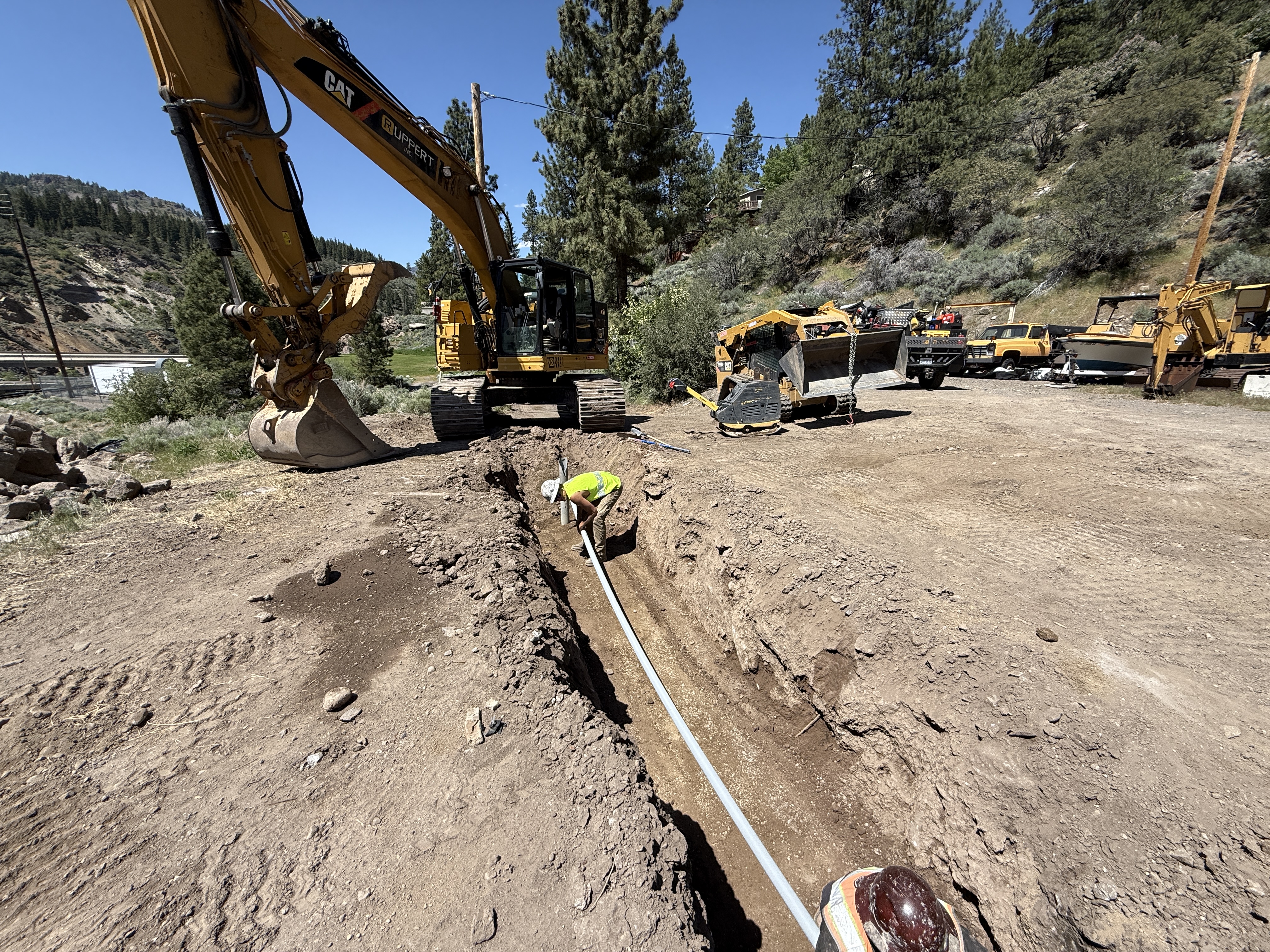 The image shows a trench with a person working inside, apparently installing or handling a pipe. An excavator is situated to the left side of the trench, which is relatively straight and parallel to a clearly visible road nearby. Various vehicles and equipment can be seen parked in the background. The scene suggests trenching operations possibly related to conduit or piping work.