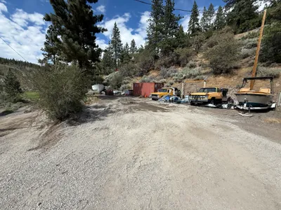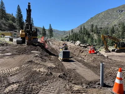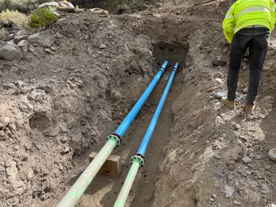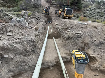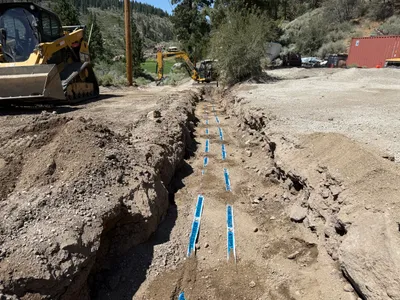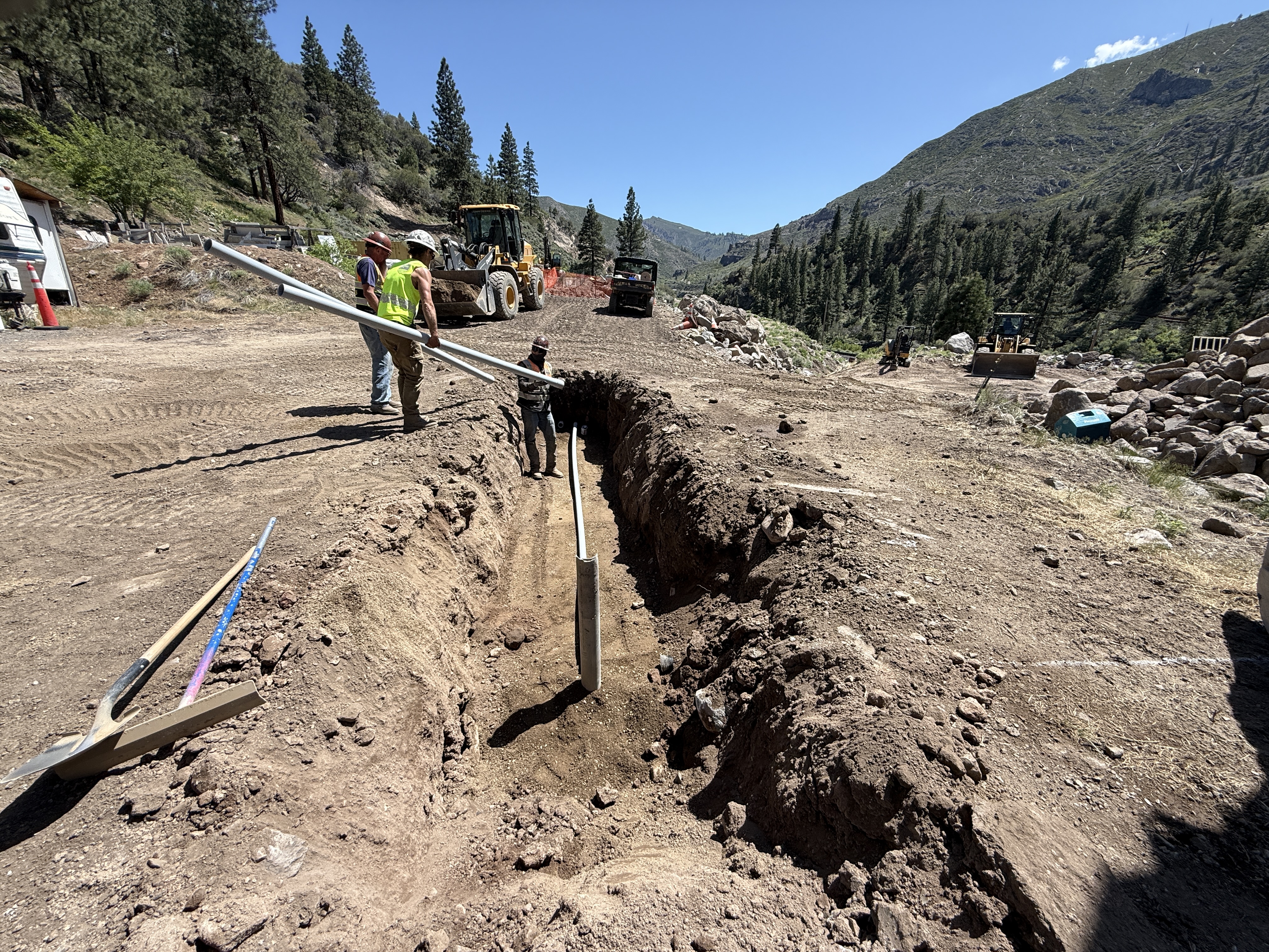 The image shows a trench with workers handling and positioning conduit pipes within it. There are three individuals visible; one is in the trench while two are outside helping to align the pipe. Excavation equipment, such as a backhoe, is in the background. The site is located in a mountainous area with visible pine trees.