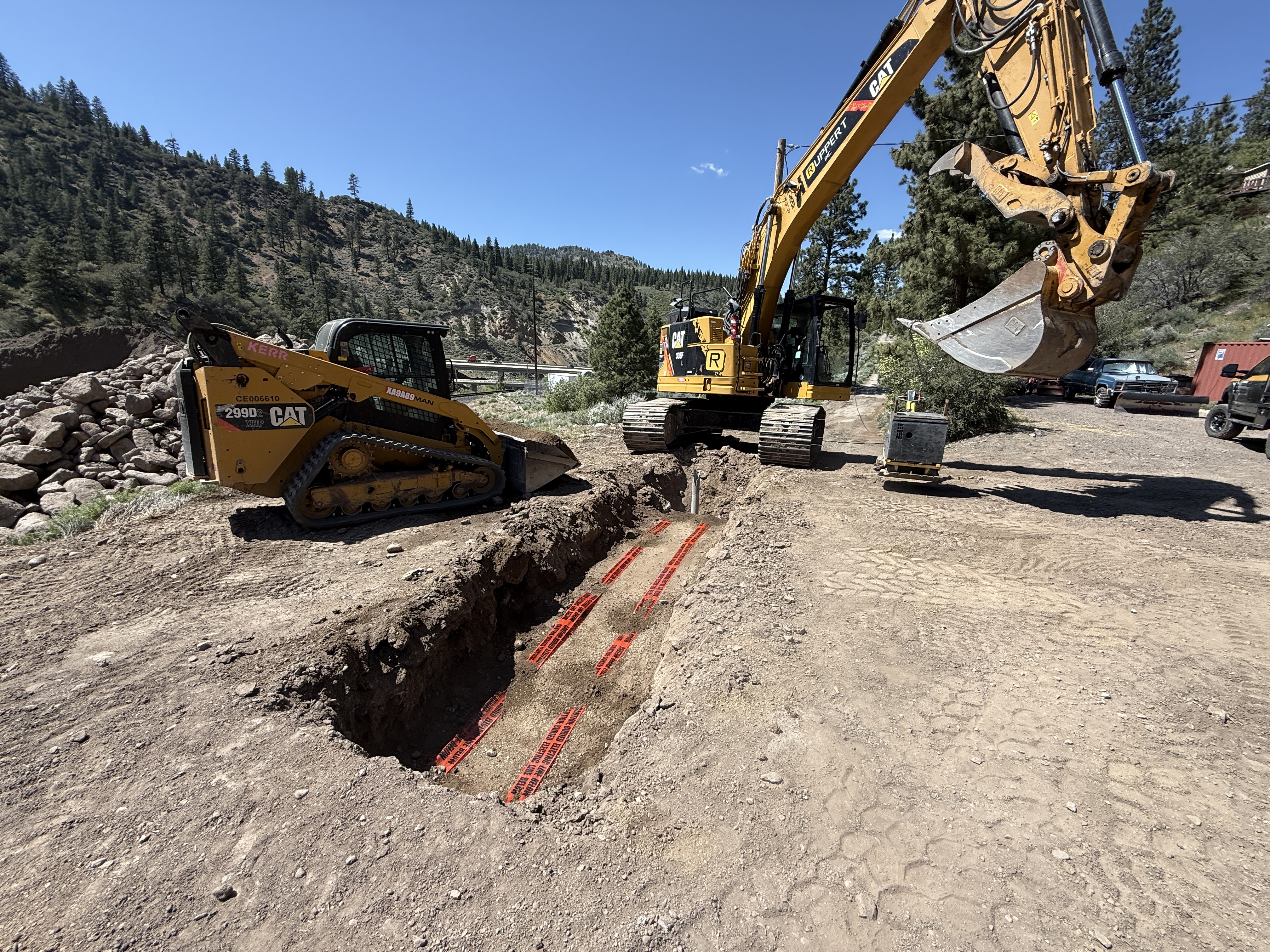 The image shows an open trench in a dirt area, with red protective tape visible inside. To the right of the trench, a large excavator is positioned with its bucket above the trench. A skid steer loader is parked on the left side of the trench. The terrain is surrounded by hills, indicating an outdoor setting.