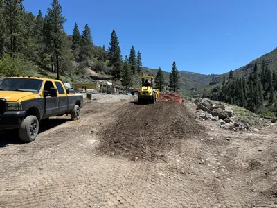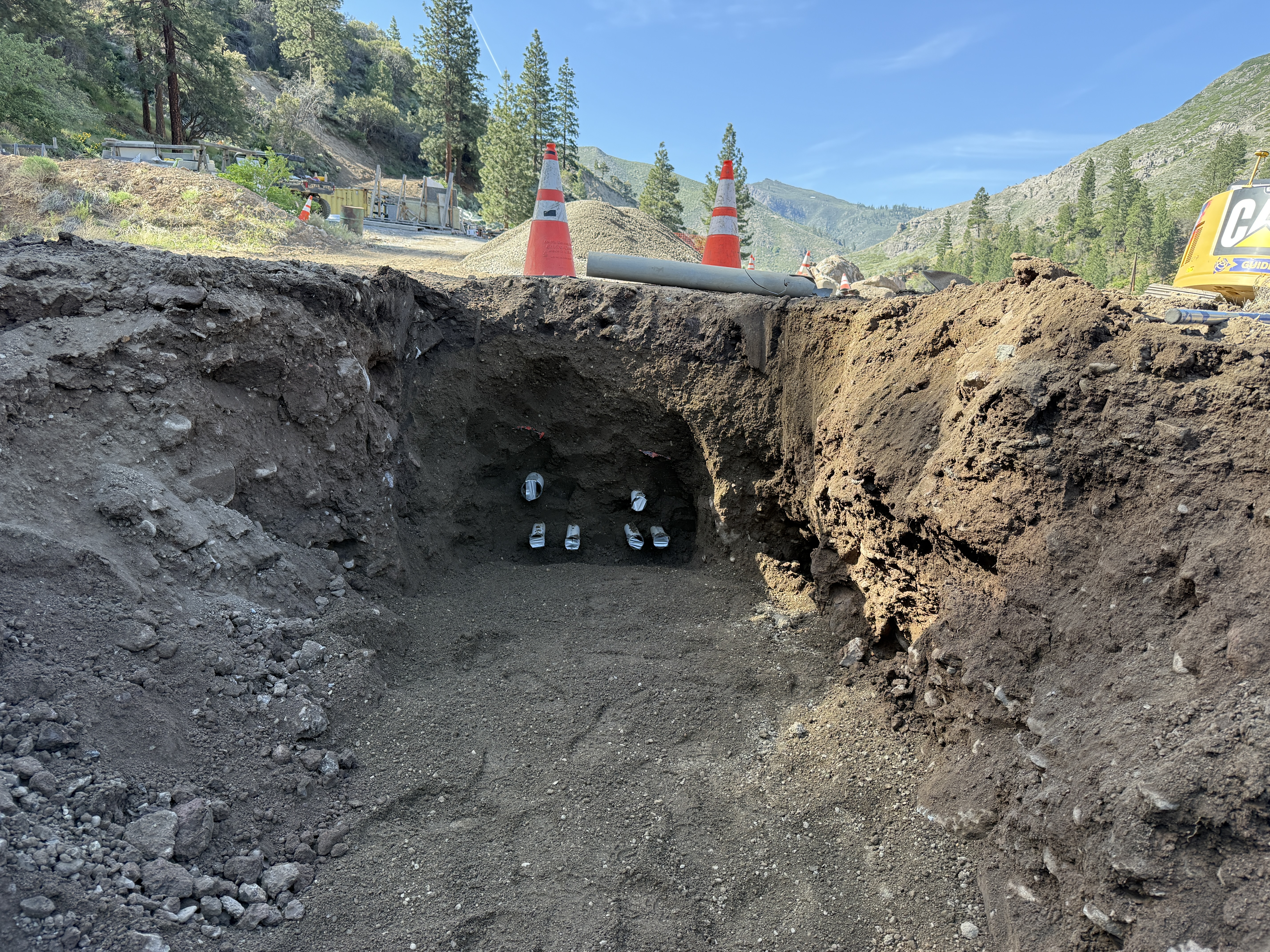 The image shows an open trench with multiple pipes entering the sidewall, likely part of a duct bank installation. Safety cones are placed on top of the trench, indicating some safety measures. Excavation equipment is visible in the background on a dirt area, suggesting ongoing work. The surrounding landscape consists of hills and trees, with clear skies visible above.