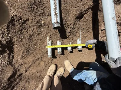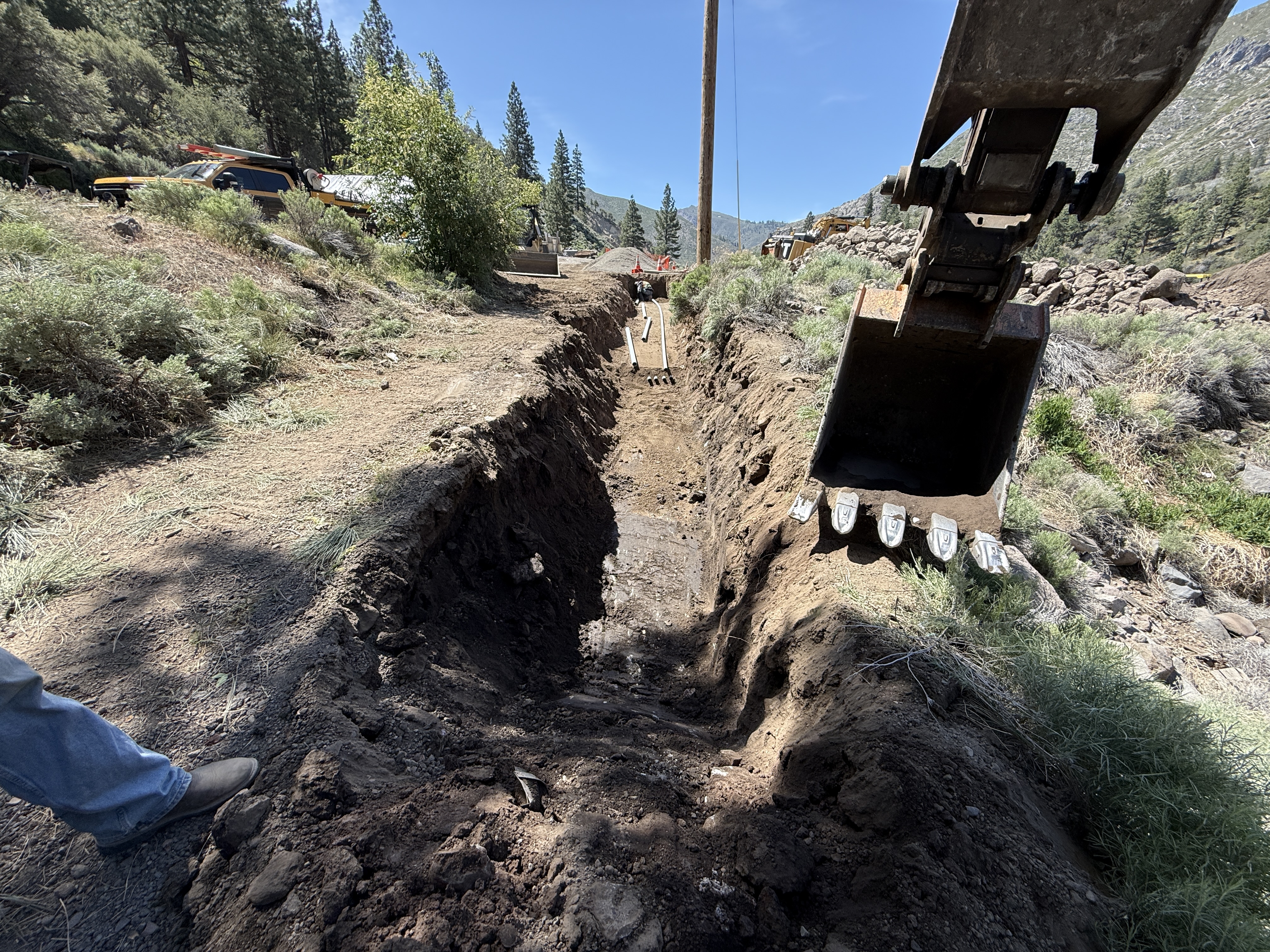 The image shows a deep trench being excavated with an excavator visible on the right side of the frame. The trench runs through a partially vegetated area, with soil piled on both sides. There is a worker's leg on the left side, and several vehicles are parked in the background, indicating ongoing work. Equipment is actively engaged in the trenching process.