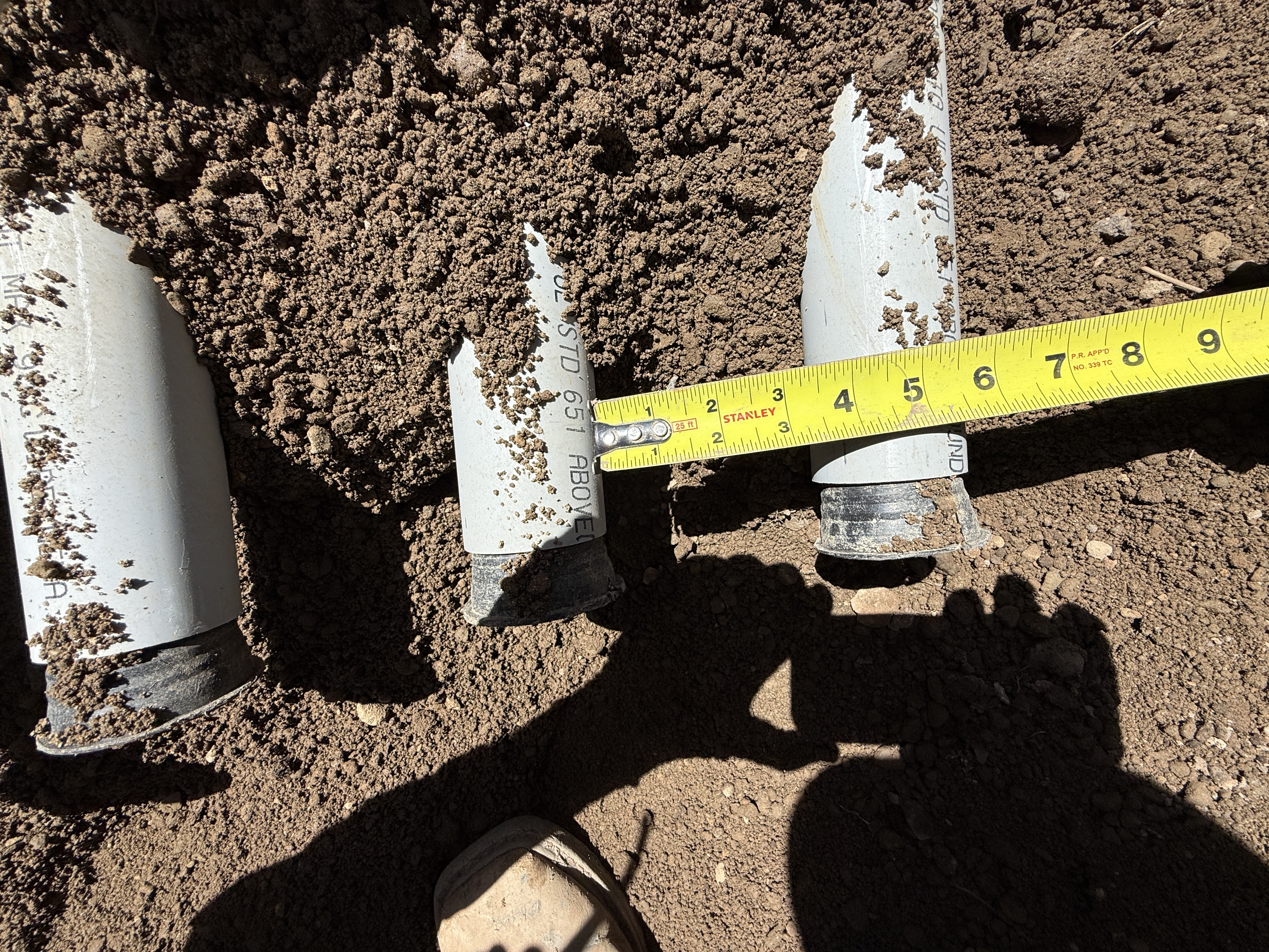 The image shows several damaged sections of electrical conduit, each partially buried in soil. A tape measure, marked in inches, spans across the conduits to measure their exposure or diameter. The conduits are arranged horizontally in an excavated area.