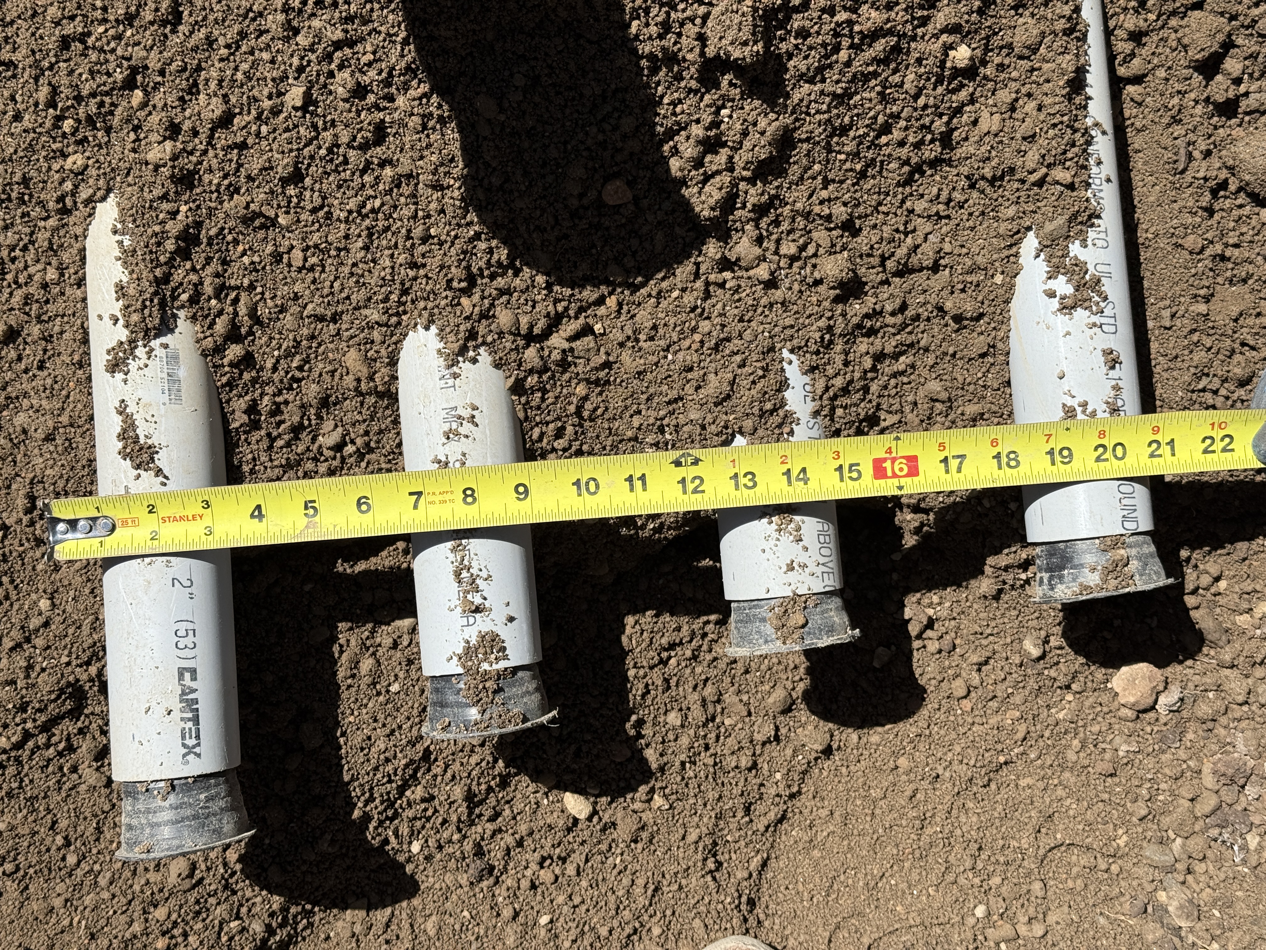 The image shows several pieces of capped PVC pipes partially embedded in sandy soil. A measuring tape is laid across the pipes, indicating their spacing and length. The pipes have dirt on them, suggesting recent excavation or preparation activity. No definitive reference to their diameter or intended use is visible.