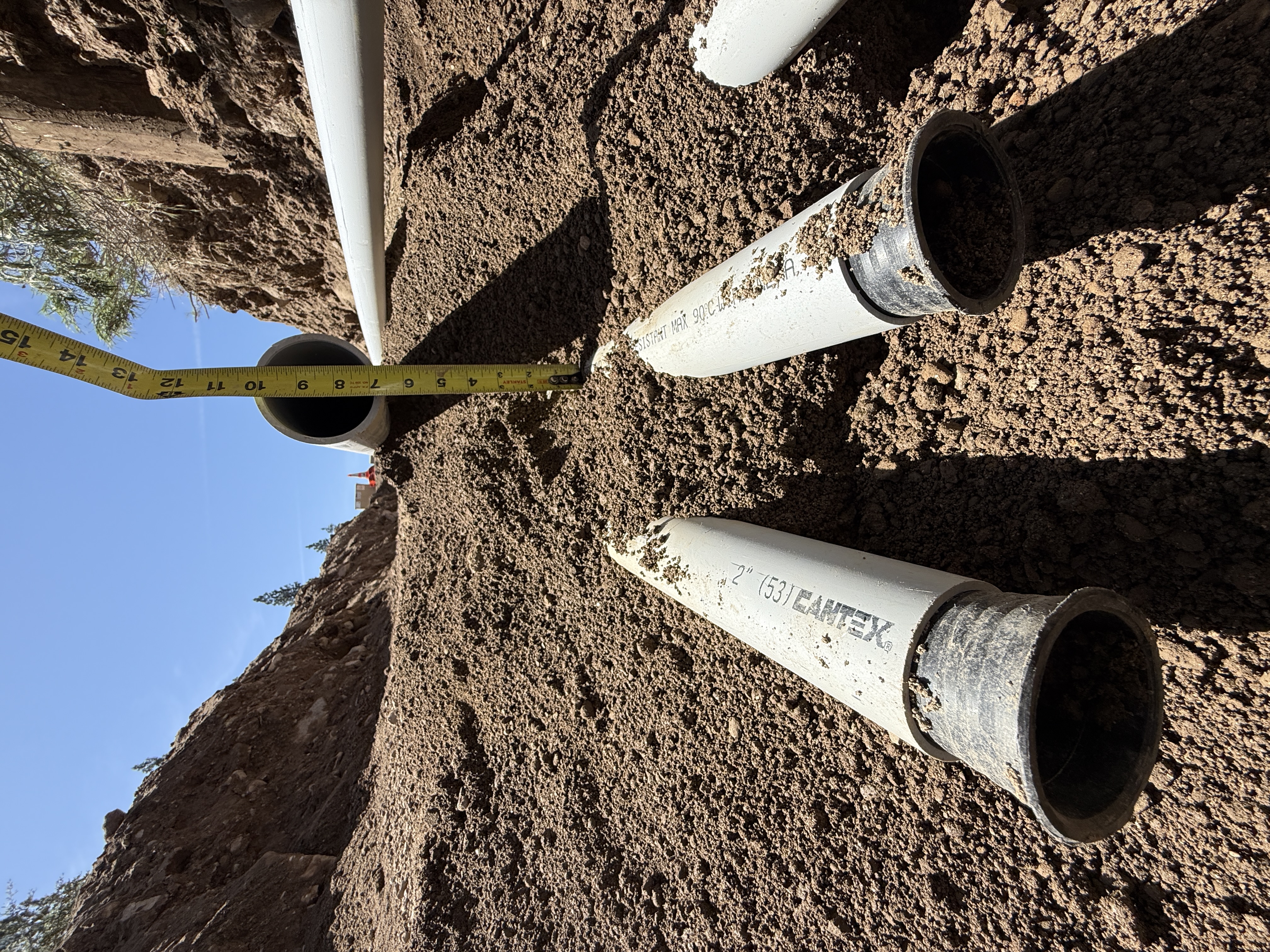 The image shows an open trench with several PVC conduits partially embedded in soil. A measuring tape extends vertically from one conduit to measure the trench depth. The trench has dirt walls, and the conduits are aligned parallel to each other. The scene is well-lit with direct sunlight.