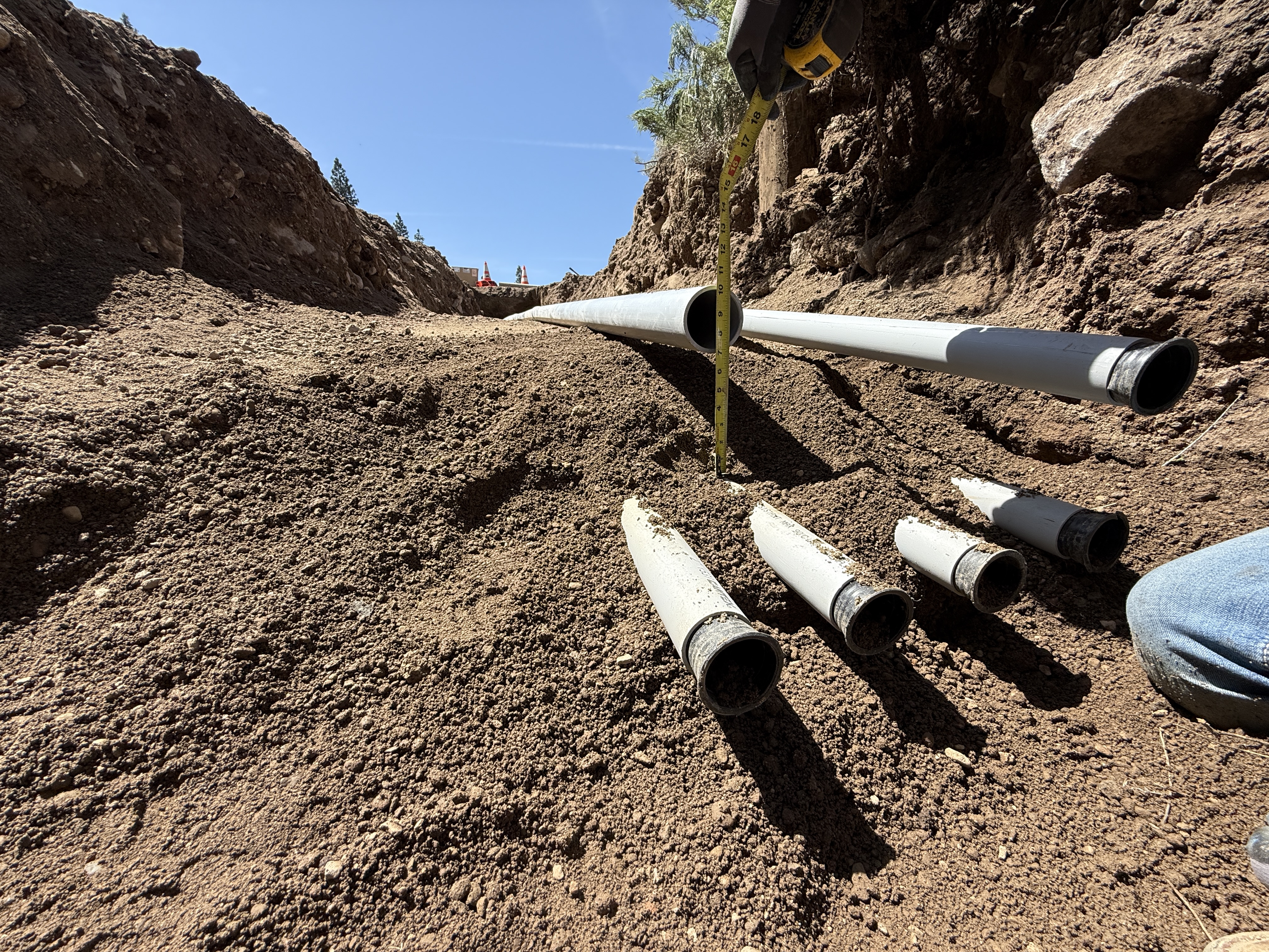 The image shows several pipes being installed in a trench with soil present around them. A person is using a measuring tape to measure the height or depth of the pipe installation. The surrounding area is a dirt trench without visible safety barriers. There are smaller pipe sections beside the main pipes, possibly for connection or extension purposes.