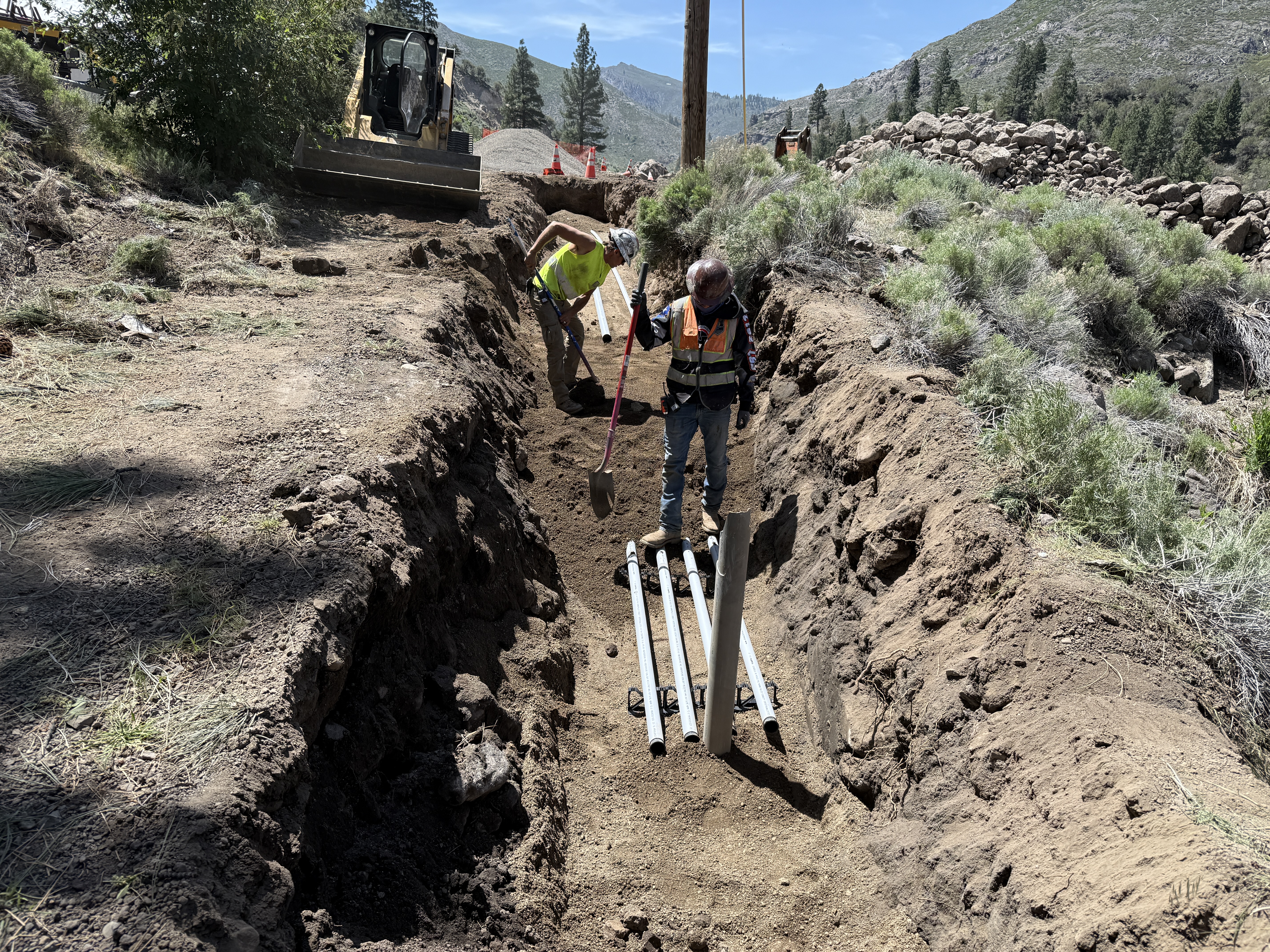 The image shows two workers installing pipes in a trench, likely for a duct bank. One worker is using a shovel, while the other is standing on the pipes. A piece of heavy machinery is visible in the background, and the surrounding area is a rugged landscape with dirt and vegetation. The workers are wearing protective gear suitable for construction.