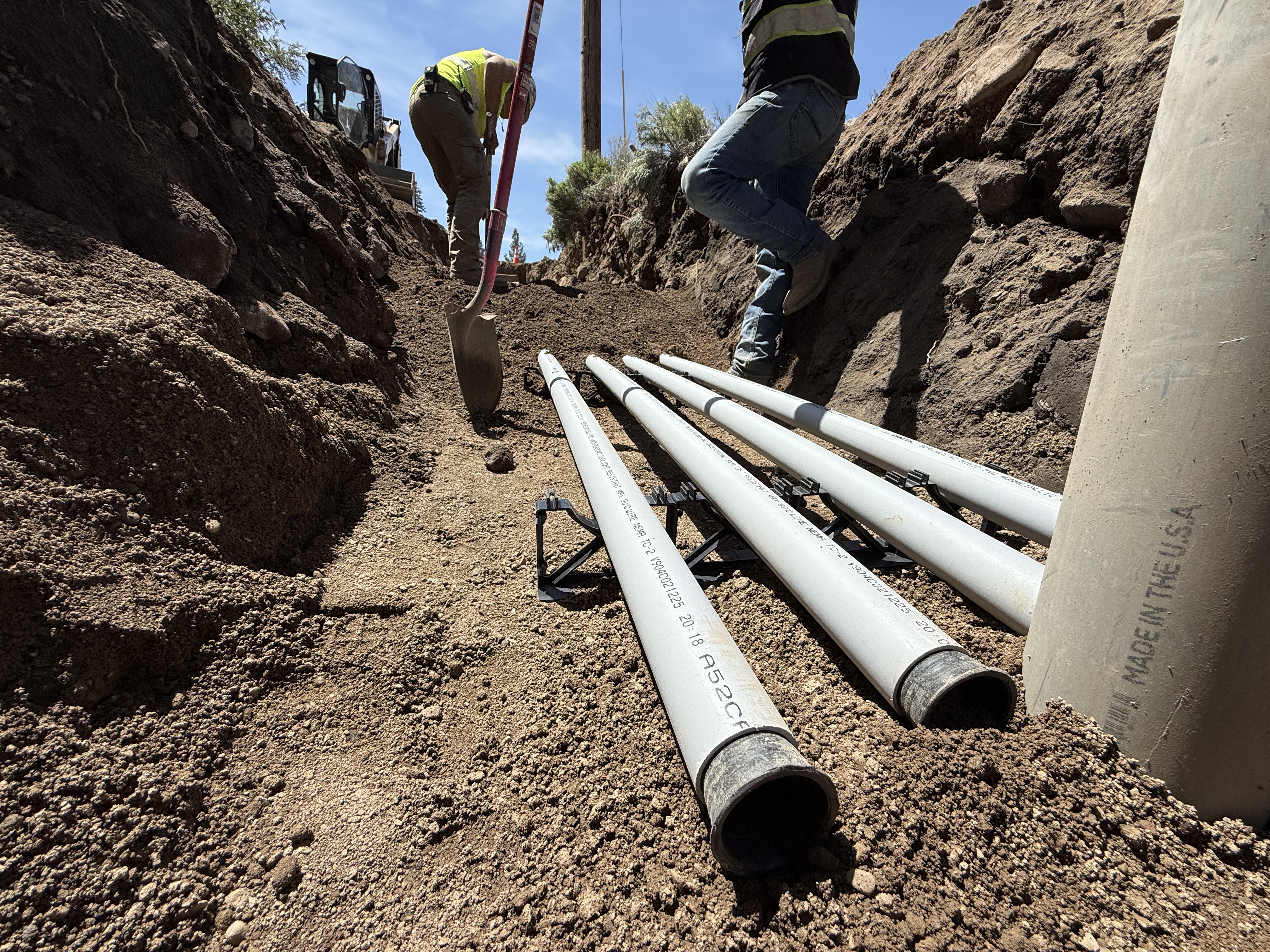 Two workers are seen in a trench with one using a shovel to work with the soil. Several PVC pipes are laid out in the trench, possibly positioned for installation. The surrounding area consists of uneven earth, likely from excavation activities. One worker appears to be preparatory or in-progress with arranging the pipes.