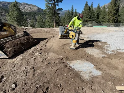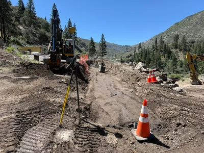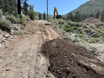 The image shows a dirt road with visible track marks from heavy equipment, indicating site-grading activity. An excavator is prominently positioned on the road, and another one is visible on a pile of rocks to the right. A truck is present beside the excavator, suggesting active work. Sparse vegetation and some cleared brush can also be observed around the work area.