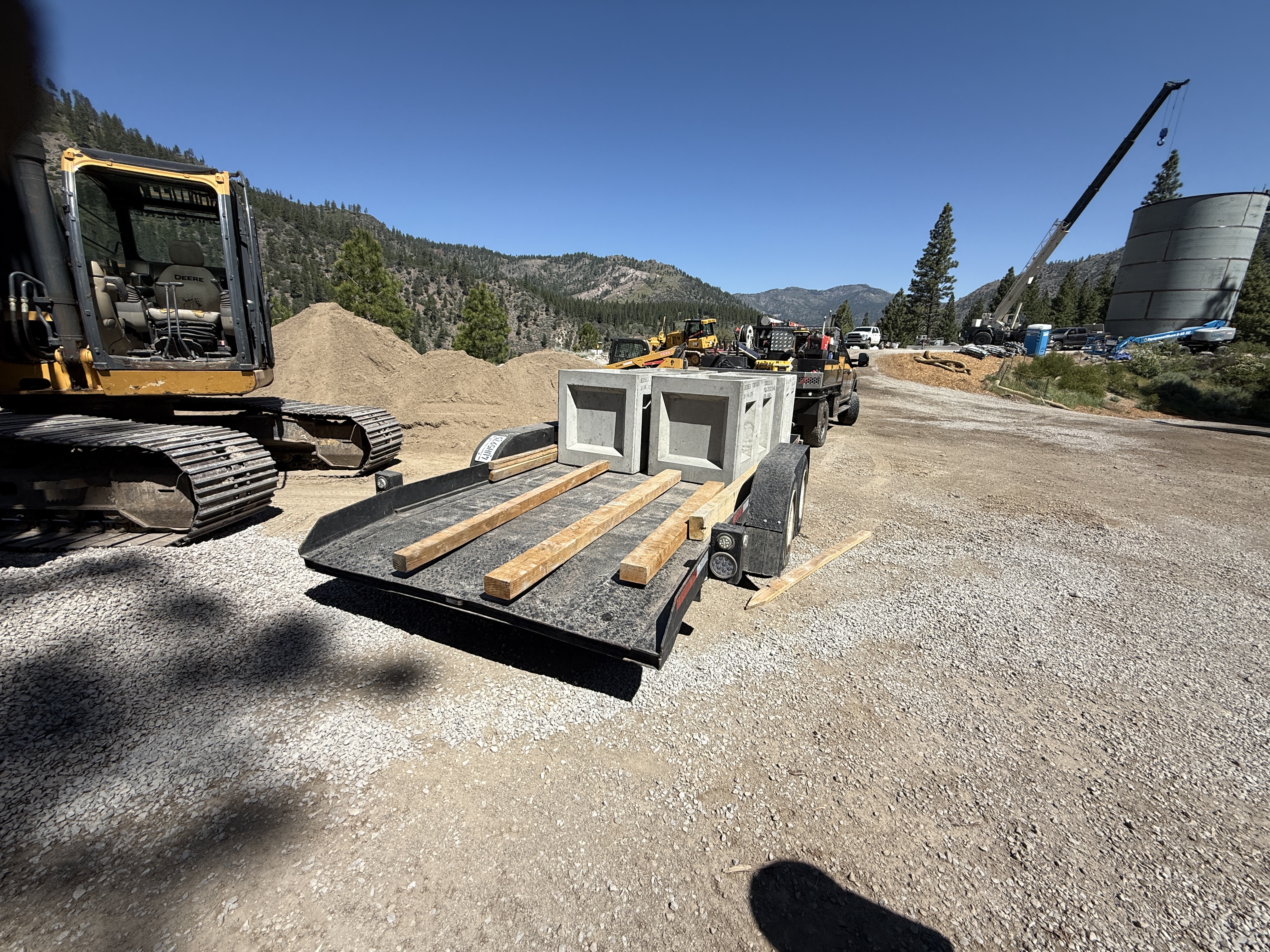 The image shows a trailer loaded with concrete blocks, situated near heavy equipment like an excavator and a crane in a rural construction area. The background features gravel piles and a large cylindrical structure, likely a water tank. The site has a gravel surface with clear weather and ample sunlight.