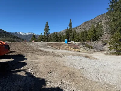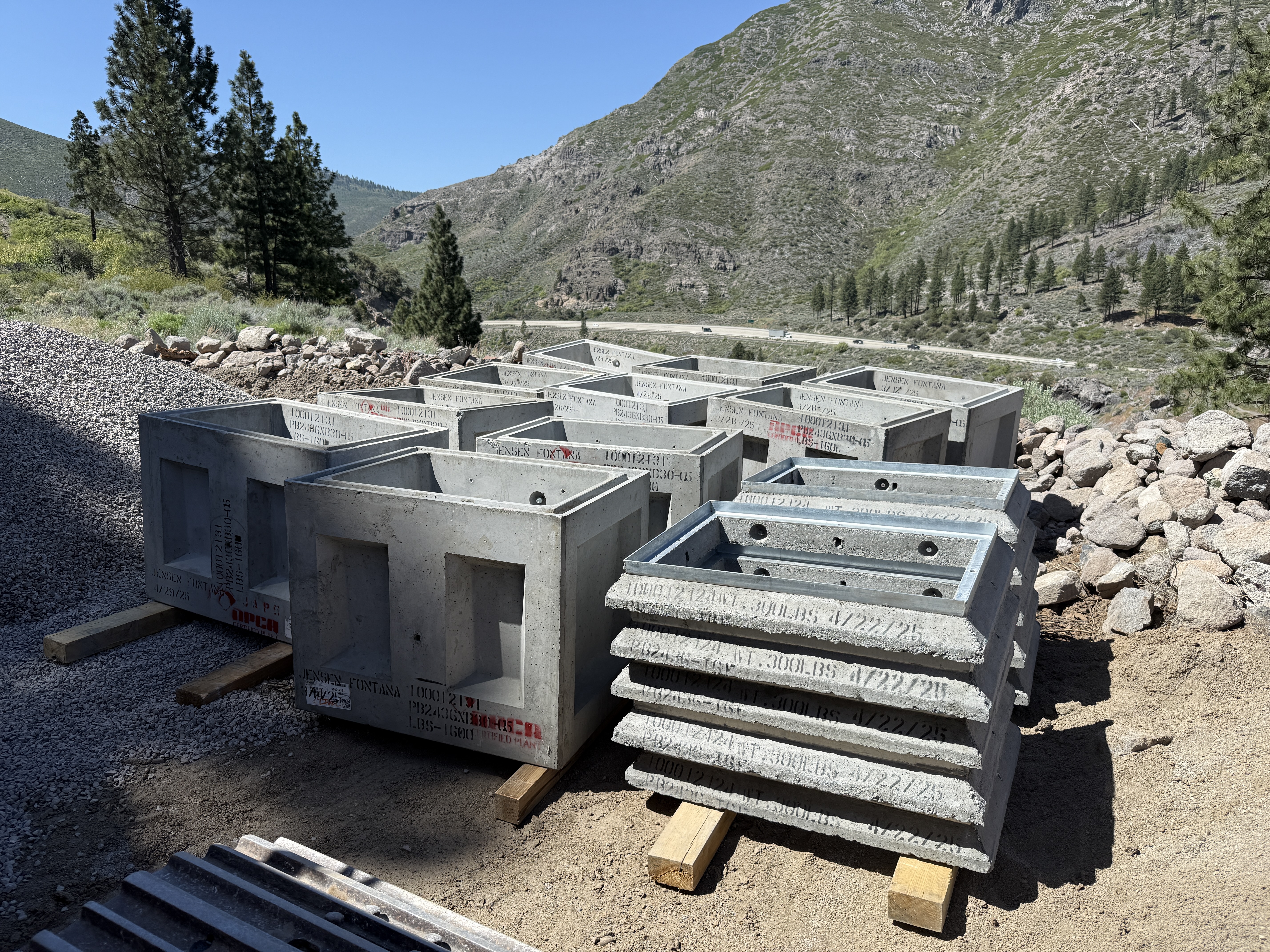 The image shows multiple concrete vaults and lids stacked on wooden pallets on a dirt and gravel surface. They appear to be in a mountainous area with a slope and some trees in the background. The number markings on the concrete components suggest they're pre-fabricated for a specific installation. No workers or active construction activities are visible in this frame.