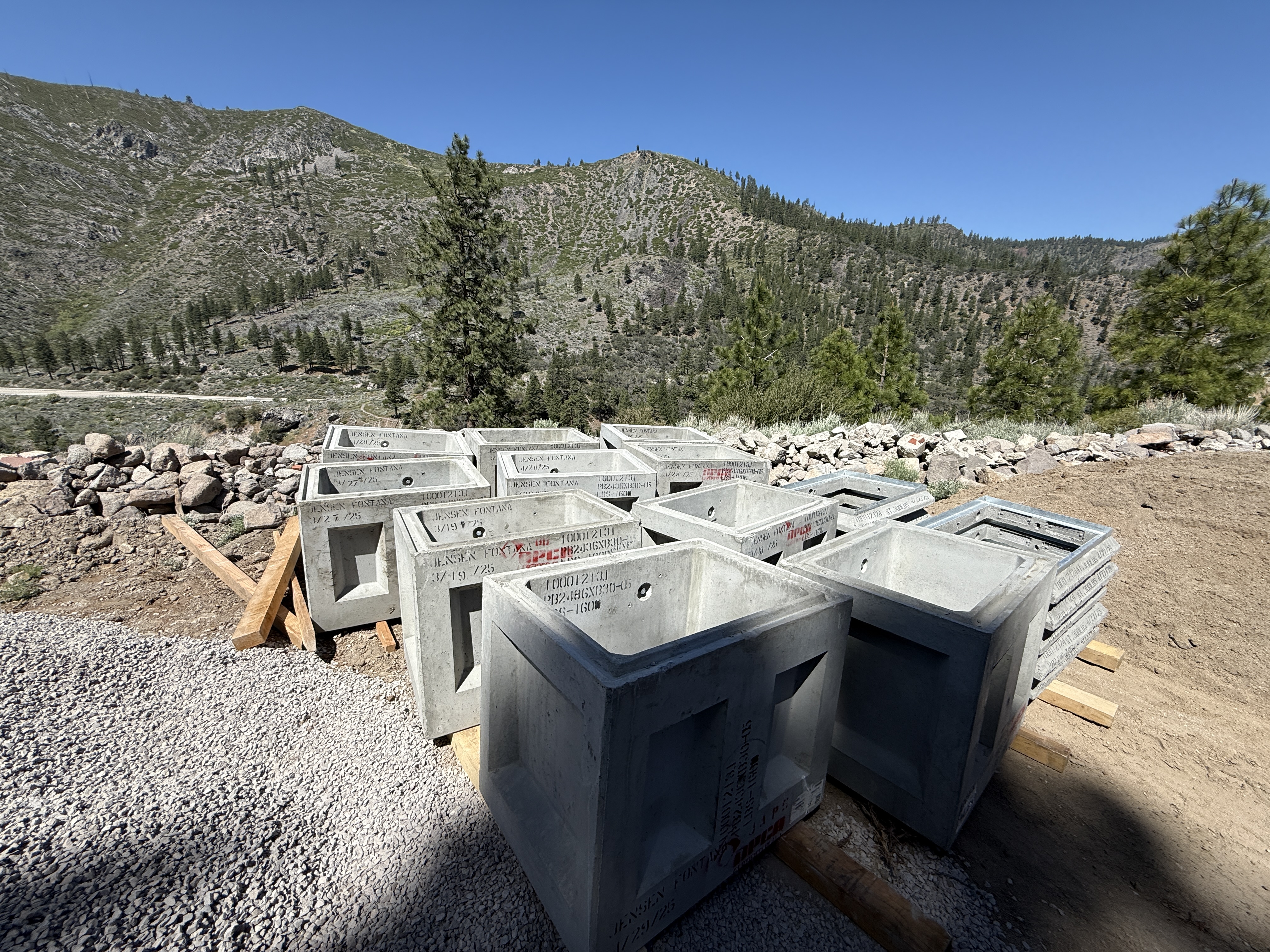 The image shows several concrete utility boxes neatly staged on wooden supports at a construction site. These boxes are likely set for installation, resting on gravel and earth. The surrounding area is mountainous, suggesting an outdoor setting. No active work or personnel are visible.