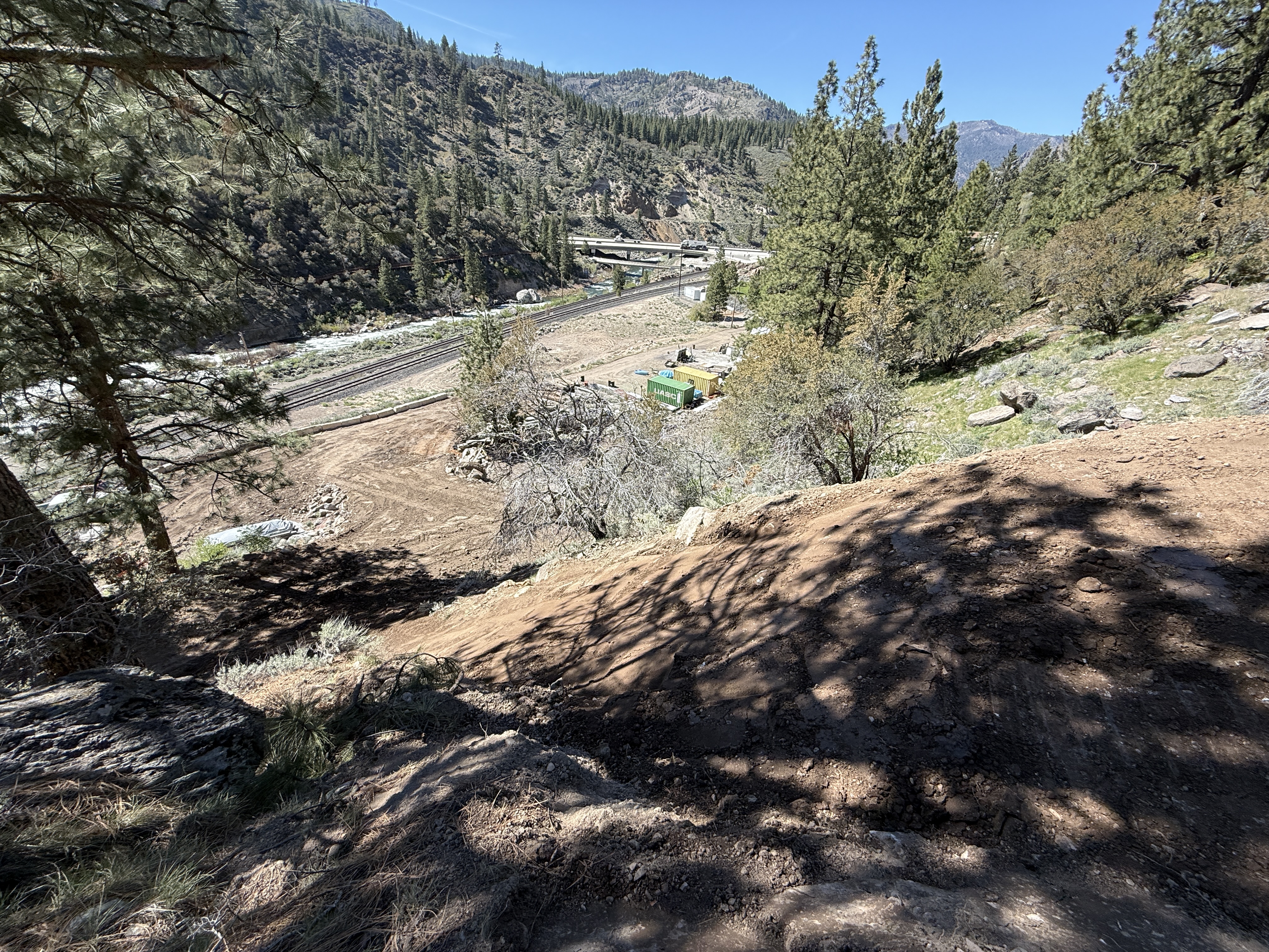 The image shows a graded slope leading down to a construction site with cleared earth and visible tracks. In the background, there are construction trailers and tracks running parallel to a river. Trees and natural terrain surround the site, and there is no visible construction equipment actively working in the frame.
