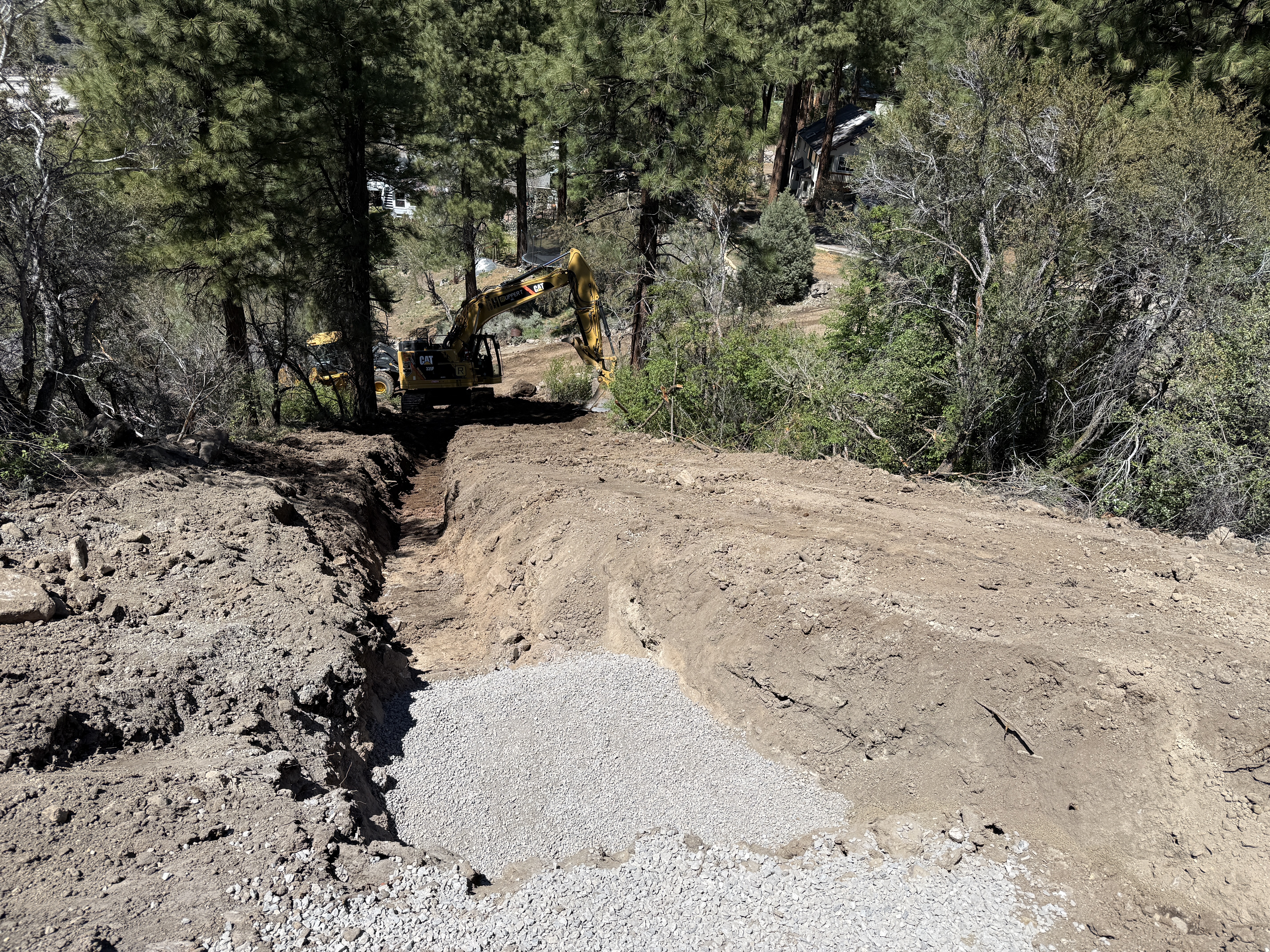 soil and gravel with an open trench clear daylight conditions limited staging area due to forested slope