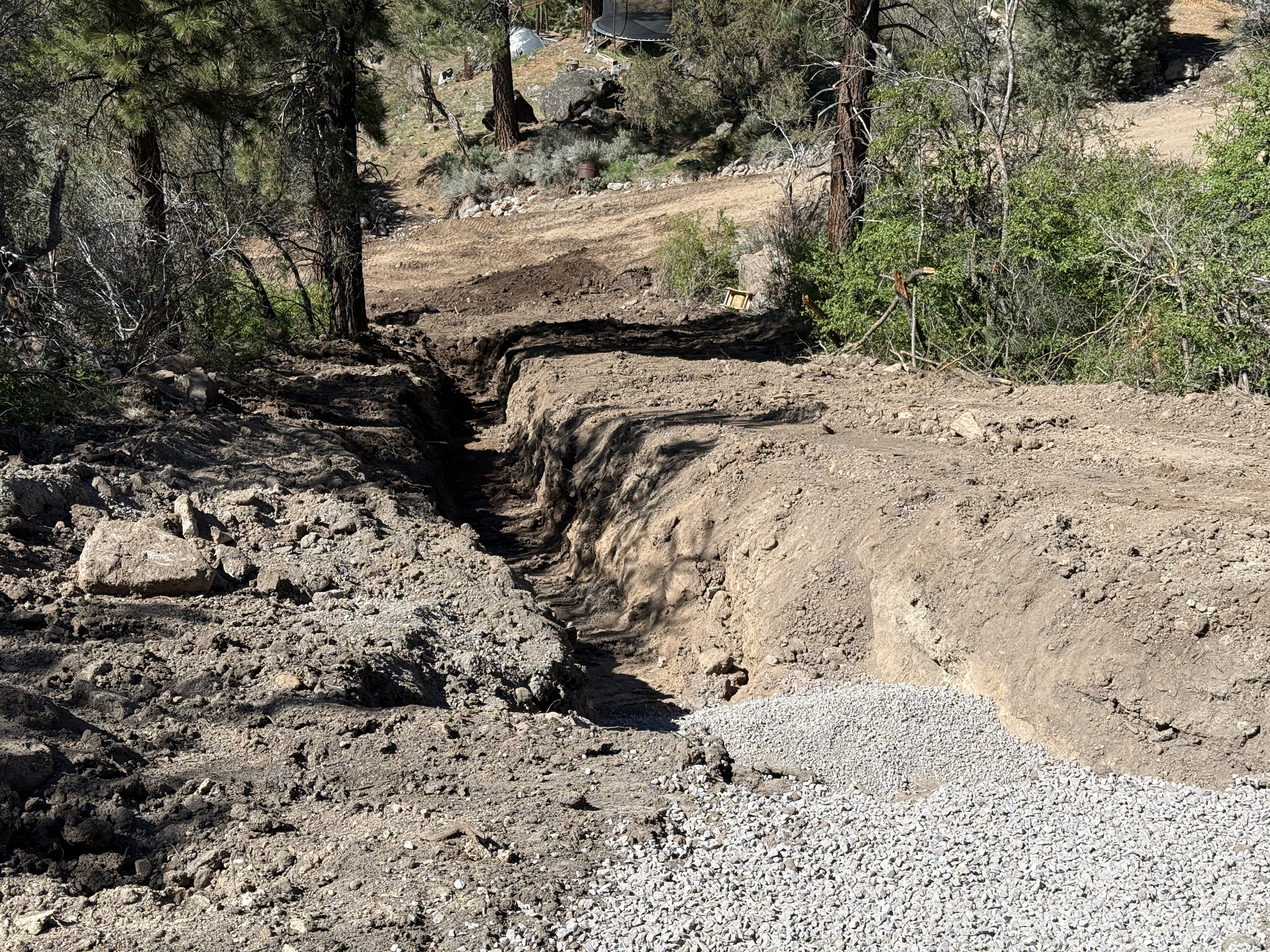 soil and gravel present along trench sunny conditions with natural lighting clear access in wooded area