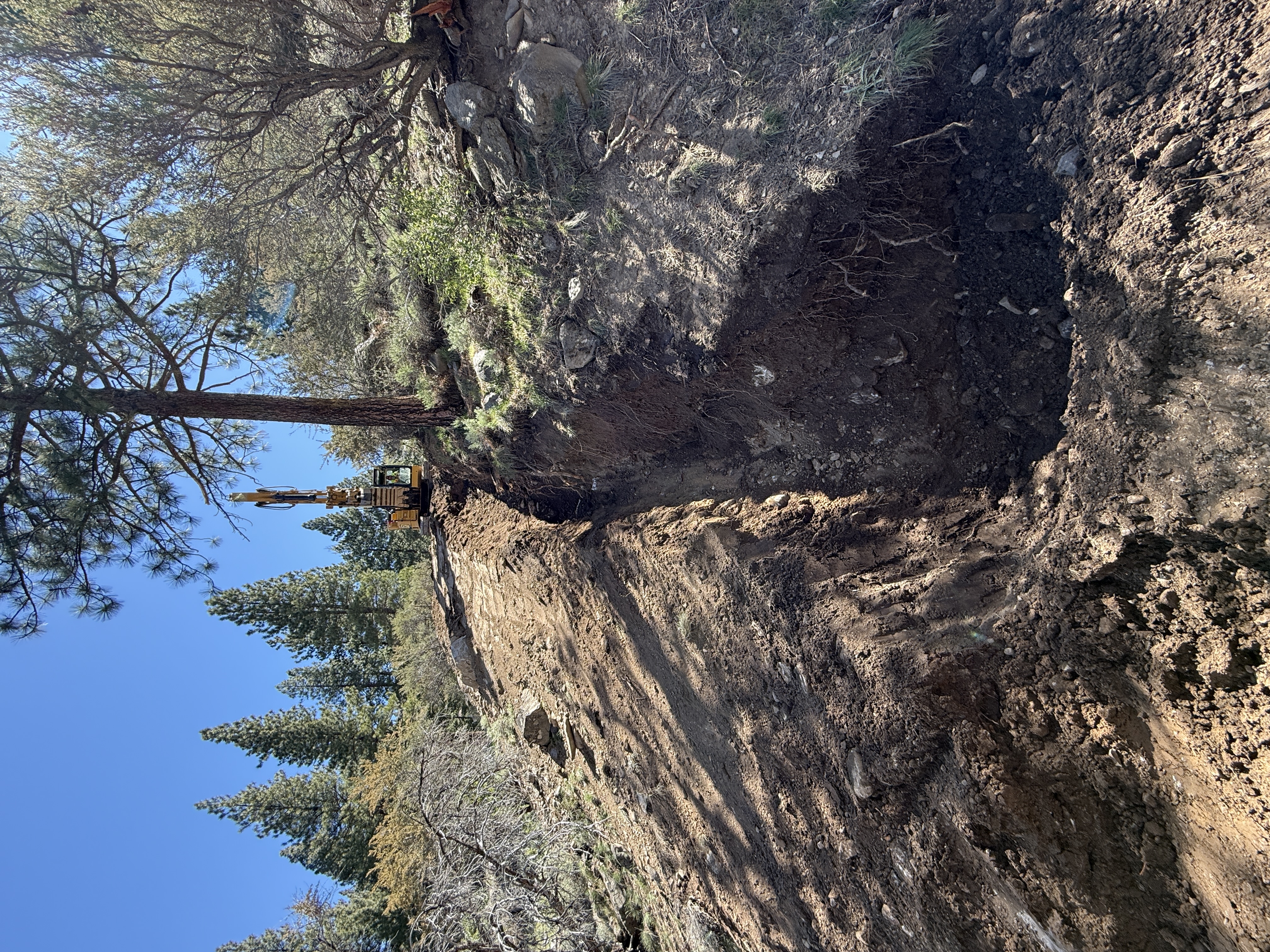 An excavator is positioned at the top of a sloped area, actively conducting excavation work. The site is in a natural, forested area with trees and bushes, and the soil appears to be freshly disturbed and excavated. The incline of the terrain is significant, and the area being worked on seems to be part of a larger construction project. An open trench with recently moved earth is visible in the foreground.