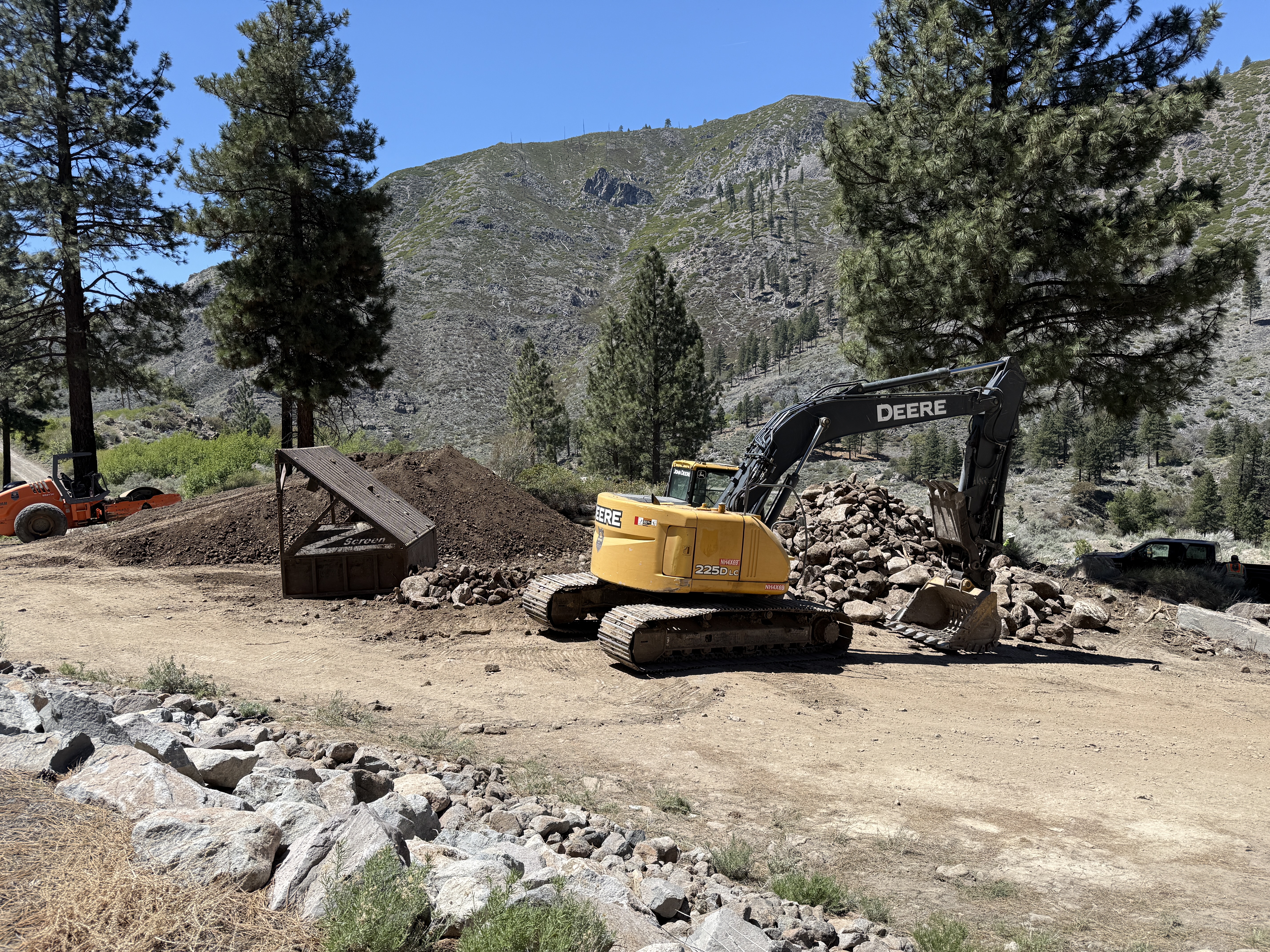 The image shows an excavator positioned on a dirt area, actively moving a pile of rocks. A soil screen and a pile of soil are visible nearby. Trees and mountainous terrain form the background. The excavator appears to be used for materials handling related to an excavation task.