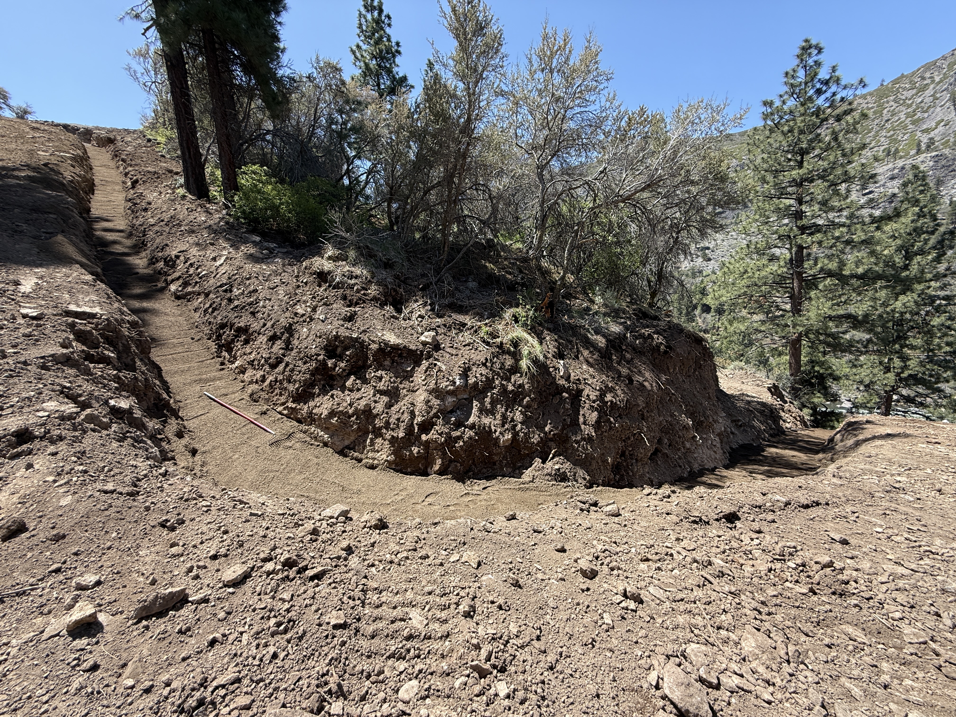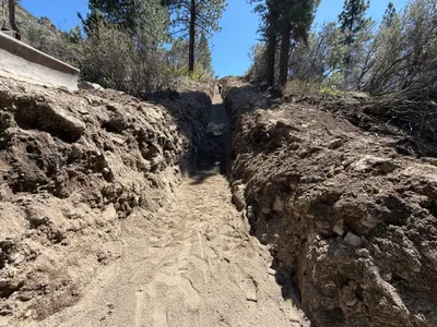The image shows a freshly dug trench along a hillside with a dirt path. A hand rake is lying on the ground, indicating recent work. Trees and sparse vegetation surround the trench area. There appears to be no visible piping or other installation elements within the trench. The site is in a rural or forested area with clear skies, indicating good weather conditions.