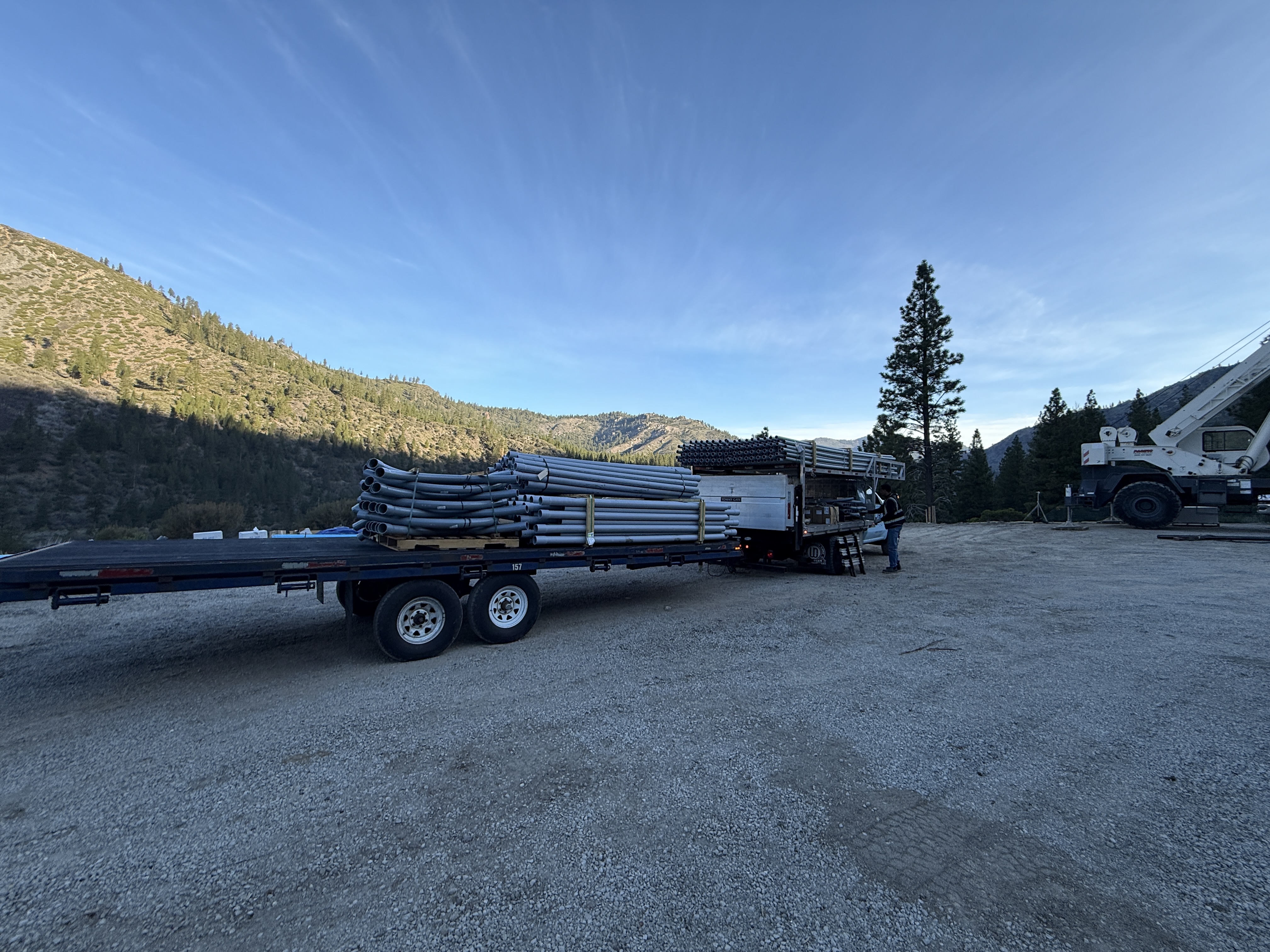 The image shows a flatbed trailer partially loaded with stacks of metal pipes. A person is standing next to the trailer, possibly involved in loading or inspecting the materials. A crane is visible in the background, suggesting heavy lifting operations. The setting is an open area with mountainous terrain in the background.
