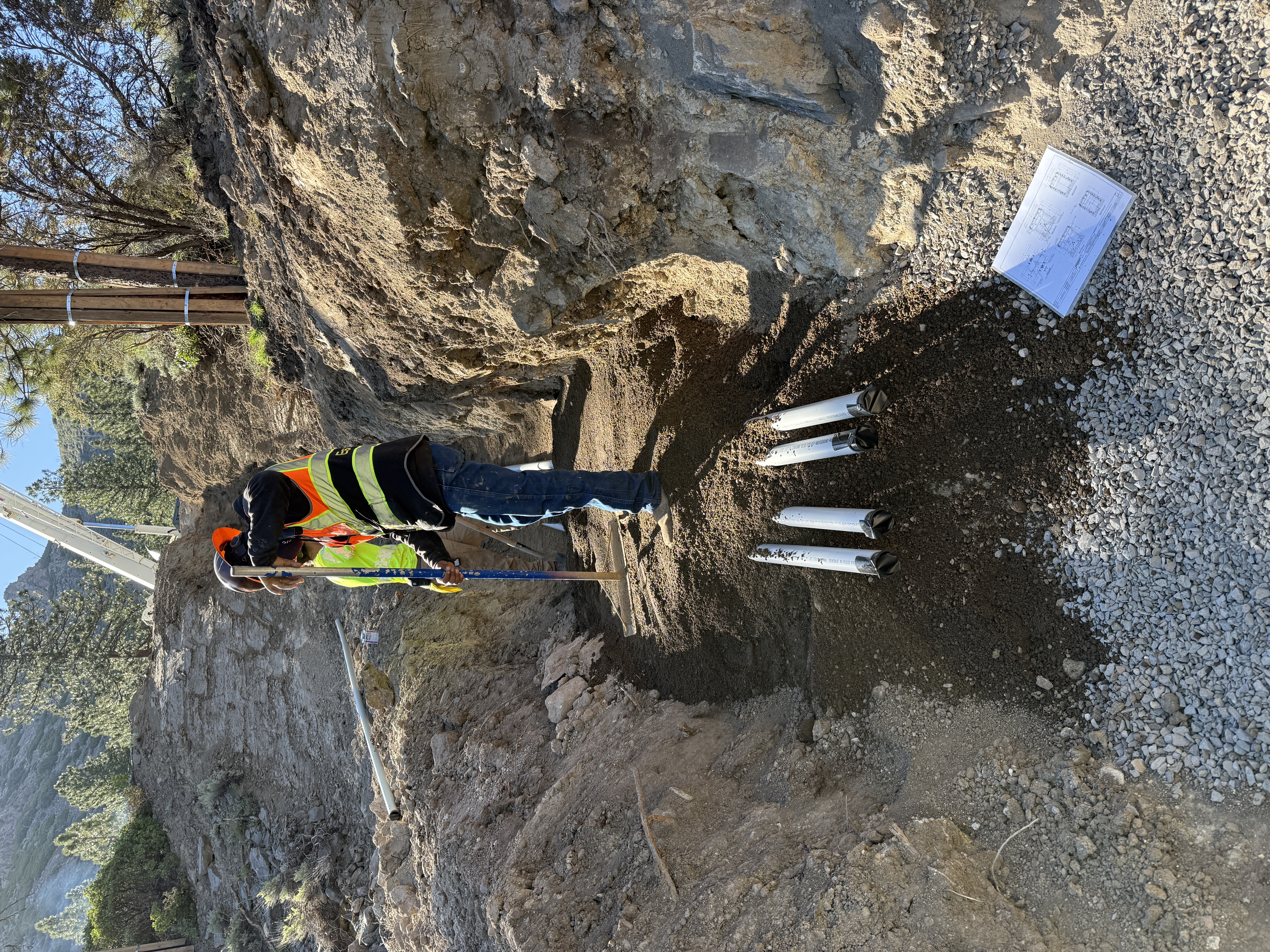 The image shows a trench where a worker in a safety vest is using a tool to level soil. Three PVC pipes are positioned parallel on the ground in the trench. There is a paper plan lying near the pipes. The area appears to be outdoors with trees and a slope in the background.