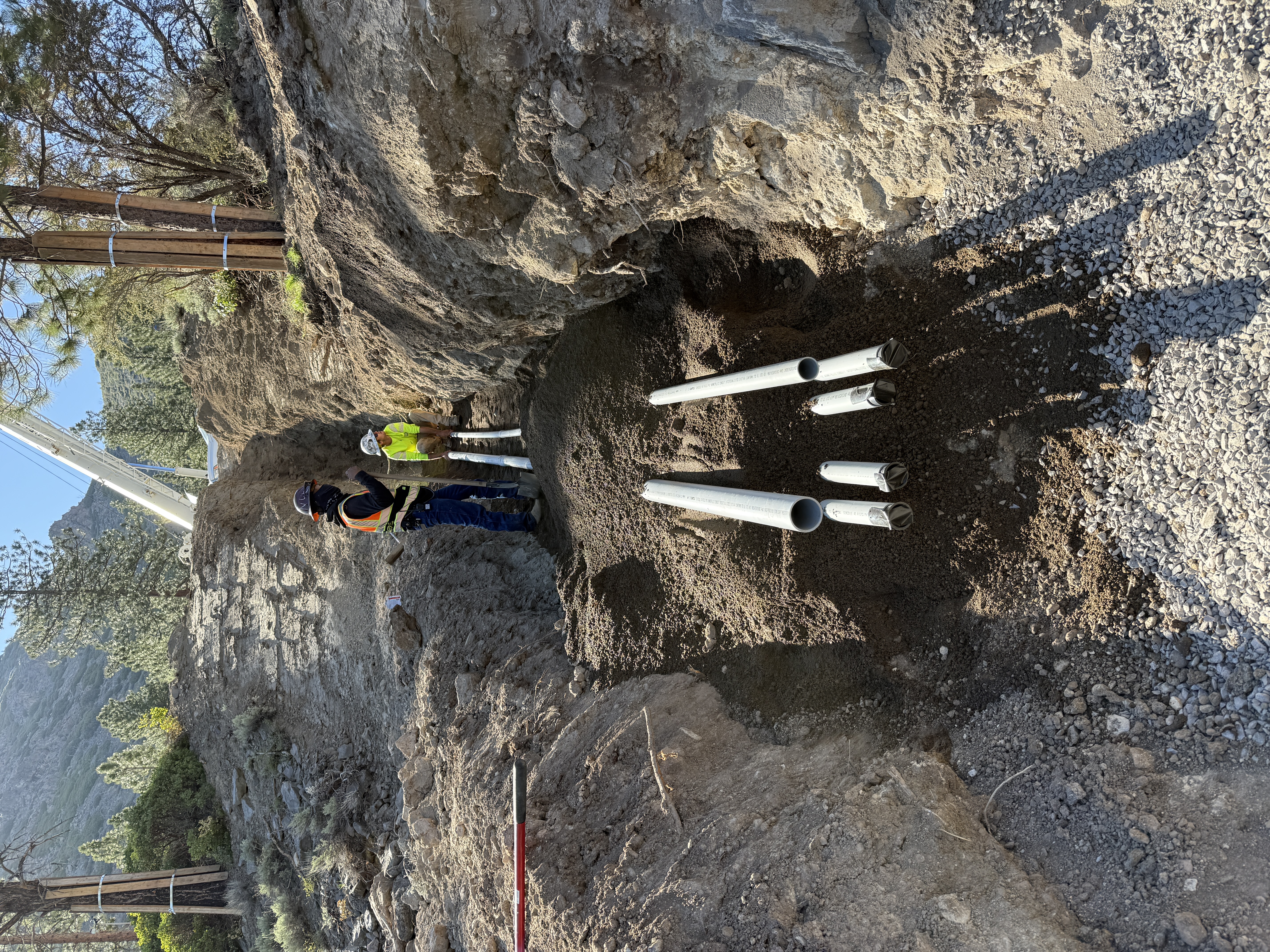 The image shows two workers in a trench handling white conduits, likely part of a duct bank installation. The conduits are positioned horizontally and appear newly placed in a dirt trench. The area is surrounded by trees and dirt, indicating a natural setting. One worker is standing near the trench edge while the other is crouched further inside the trench.