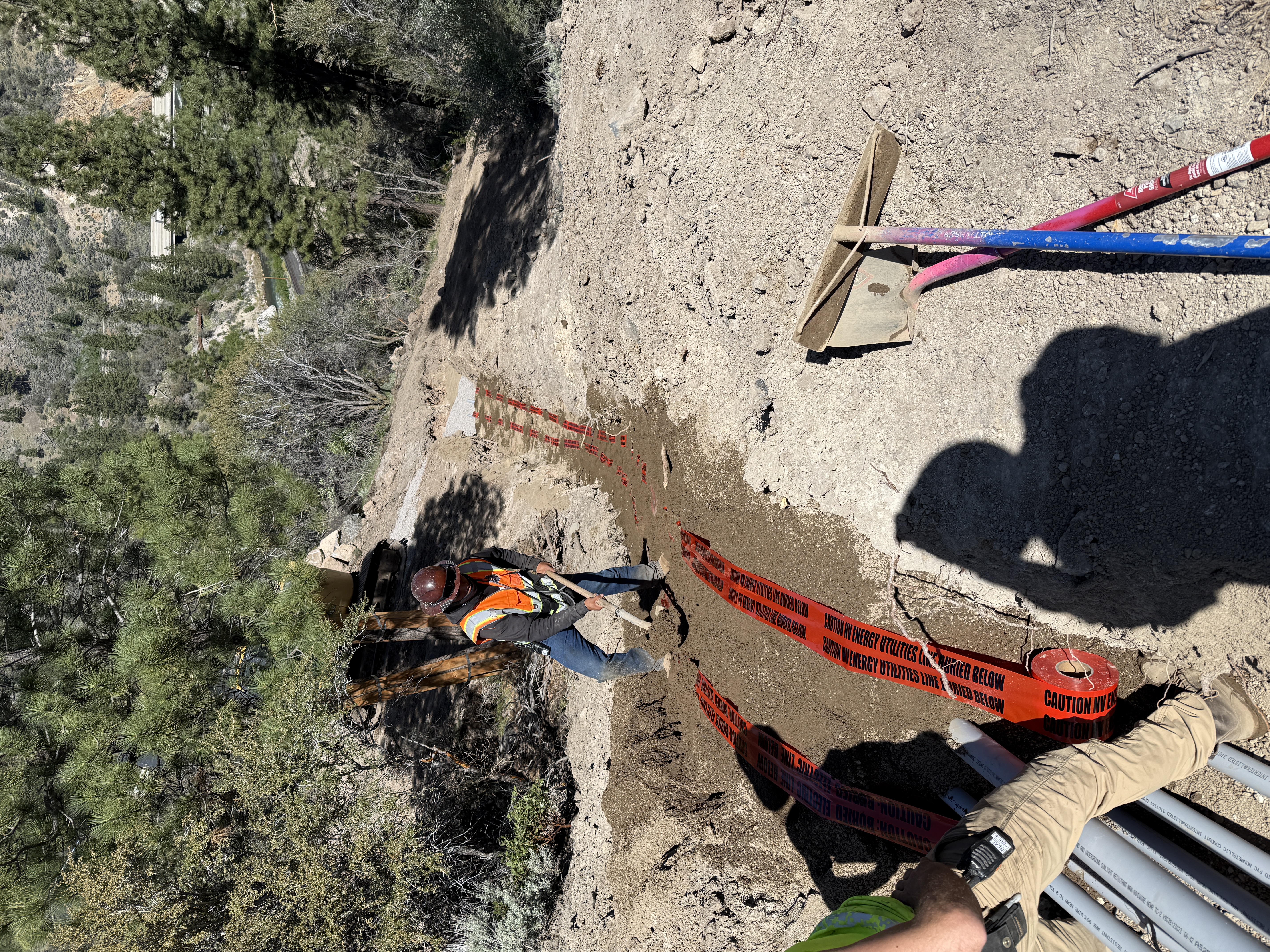 Two workers are in a trench working on backfill. One worker is using a shovel, and there is red warning tape along the trench. Pipes are staged next to the trench, and a rake is lying on the ground. The scene is set in a forested slope with visible trees.