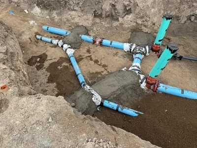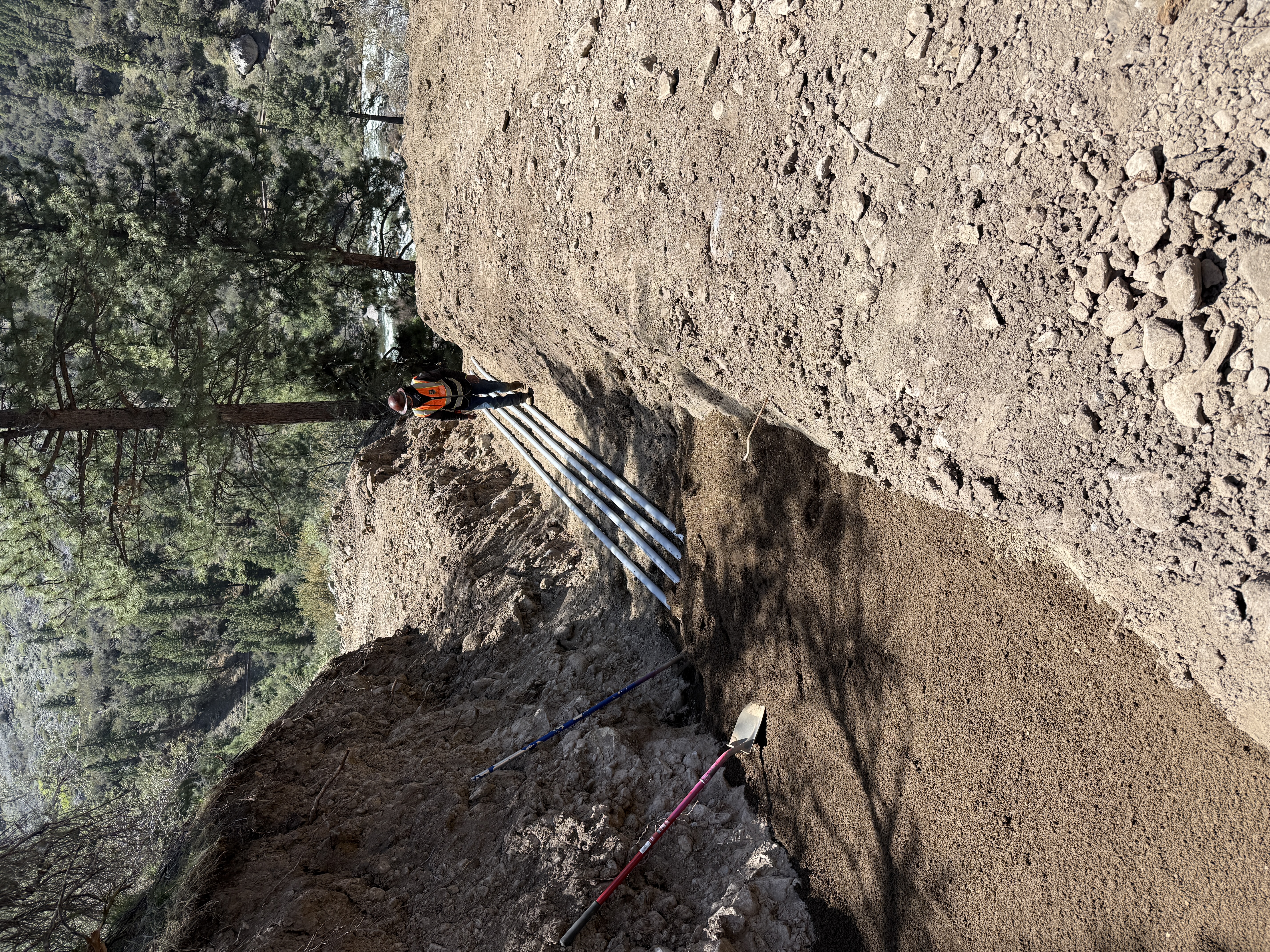 The image shows a trench in a hilly area with multiple conduit pipes installed at the bottom. A worker wearing a hard hat, hi-vis vest, and work boots walks beside the pipes. The soil appears well-compacted around the trench. Tools are visible near the trench, suggesting active or recent work. Trees and rugged terrain are in the background.