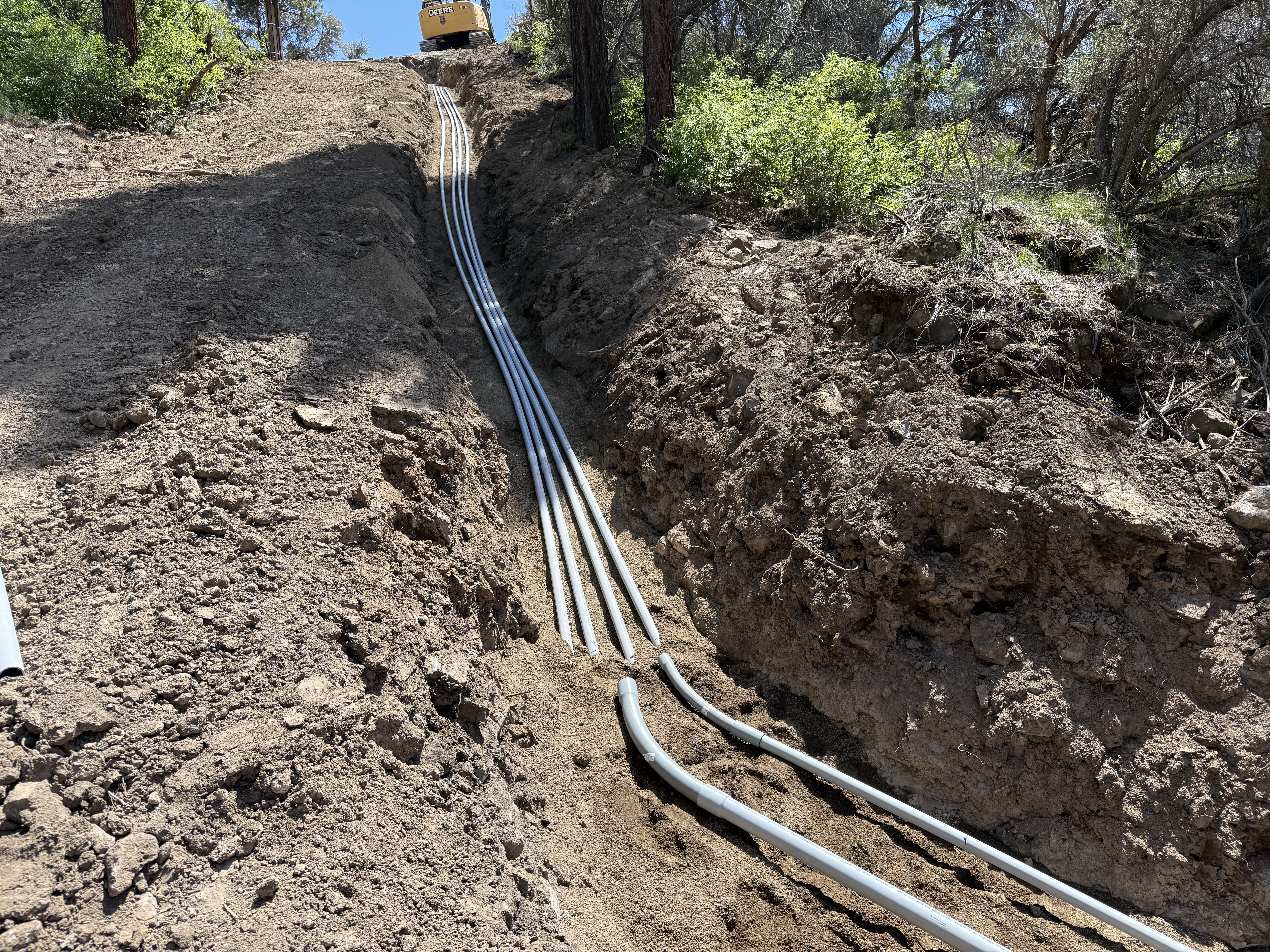 The image depicts a trench with several conduits installed along its slope, leading to a piece of heavy equipment at the top. The conduits are closely aligned, running parallel to each other. The surrounding area consists of excavated soil, indicating active trenching activities.