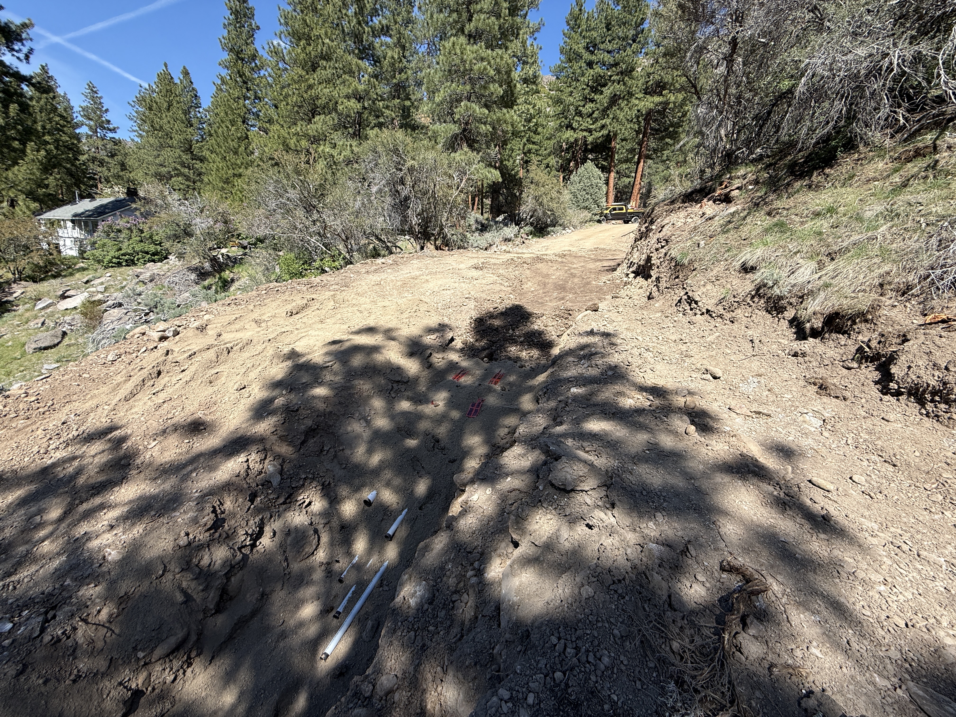 The image shows a slightly inclined dirt pathway with trenching work evident. In the foreground, an open trench contains a few visible pipes or conduits lying within. The background displays a mixture of trees and a building, suggesting a rural or forested location. There are no visible barriers or safety controls evident in the frame.