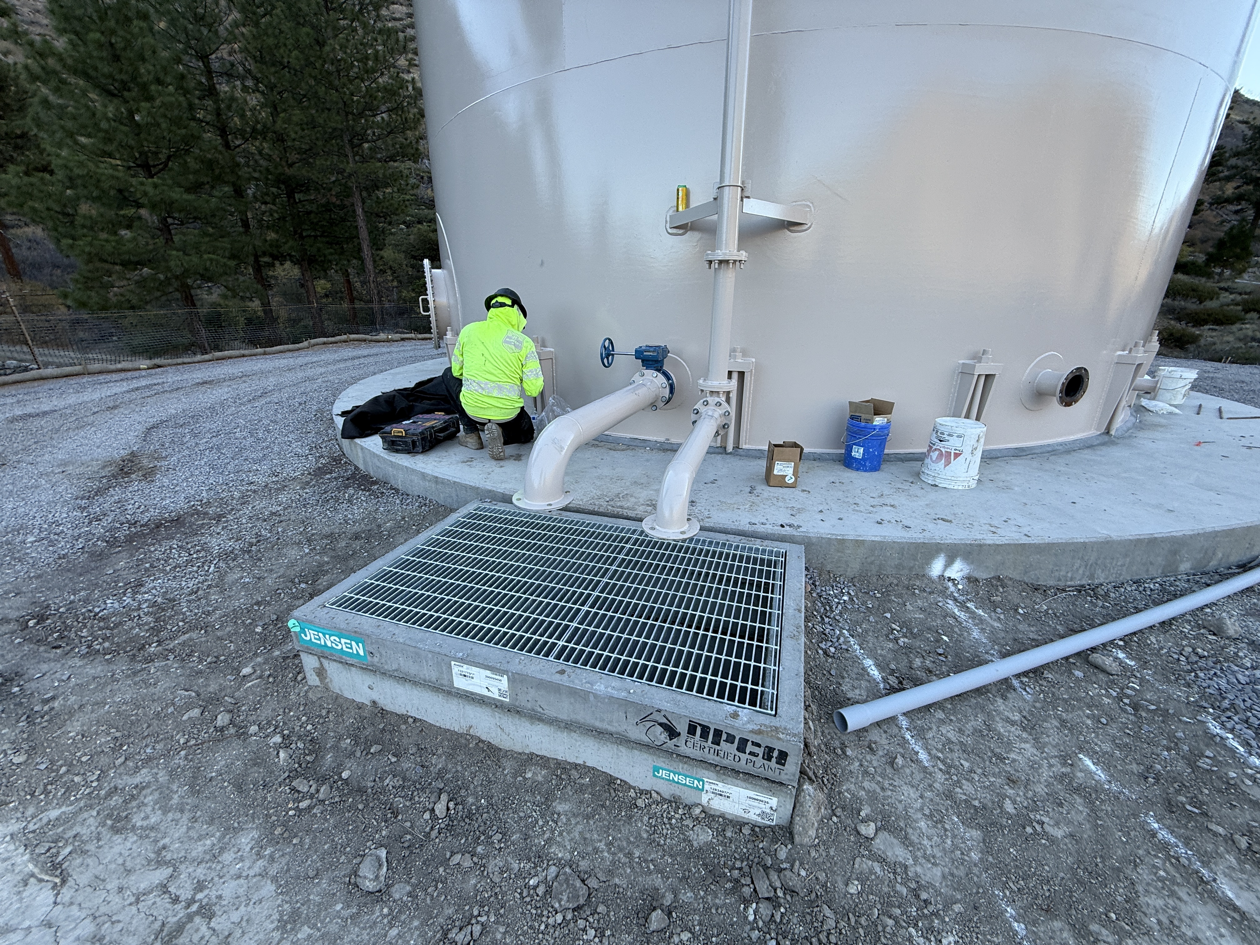 A worker in a hi-vis jacket is engaged in activity at the base of a finished water tank, possibly related to the overflow system. Two pipes are connected to the tank—one appears to be an overflow pipe. A vent or similar component is visible on top of a grid-covered feature in the foreground.