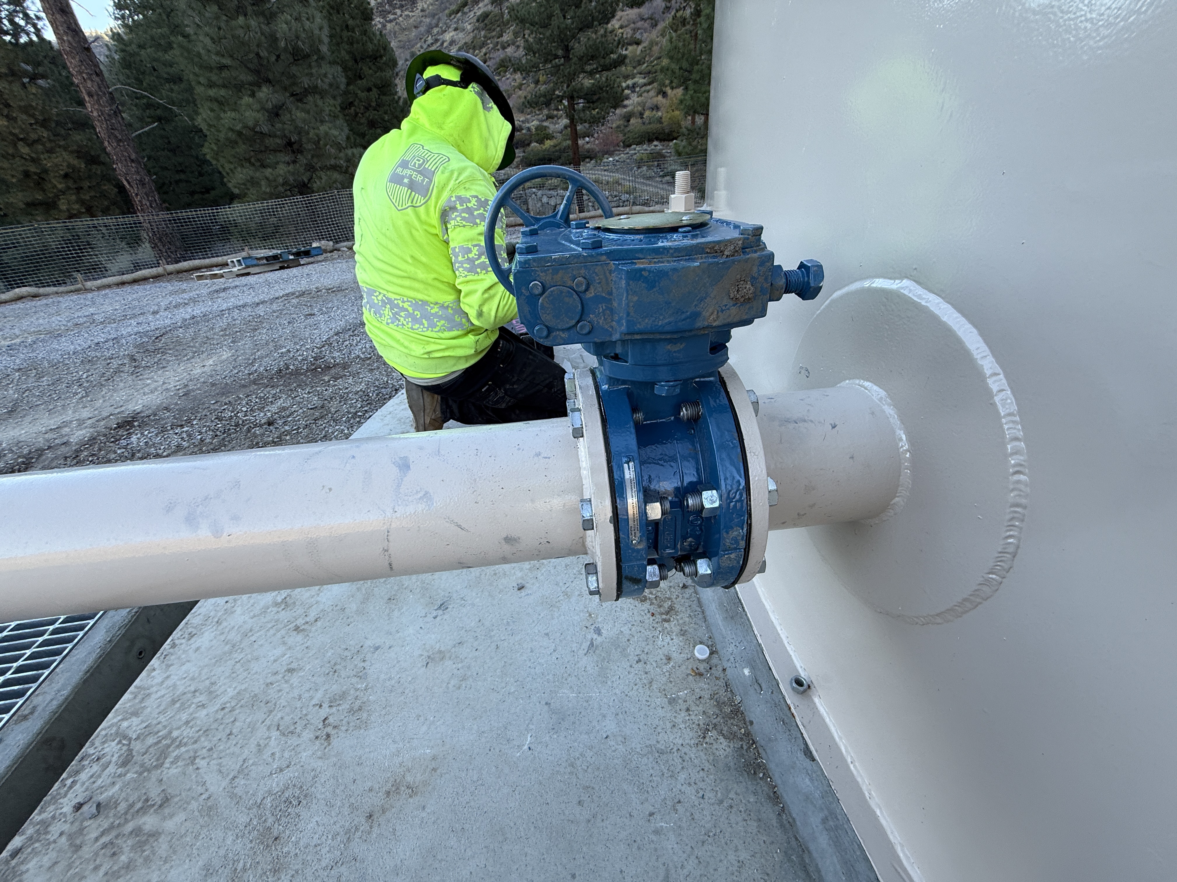 Worker is wearing PPE while inspecting or working near the valve, with a fence visible.