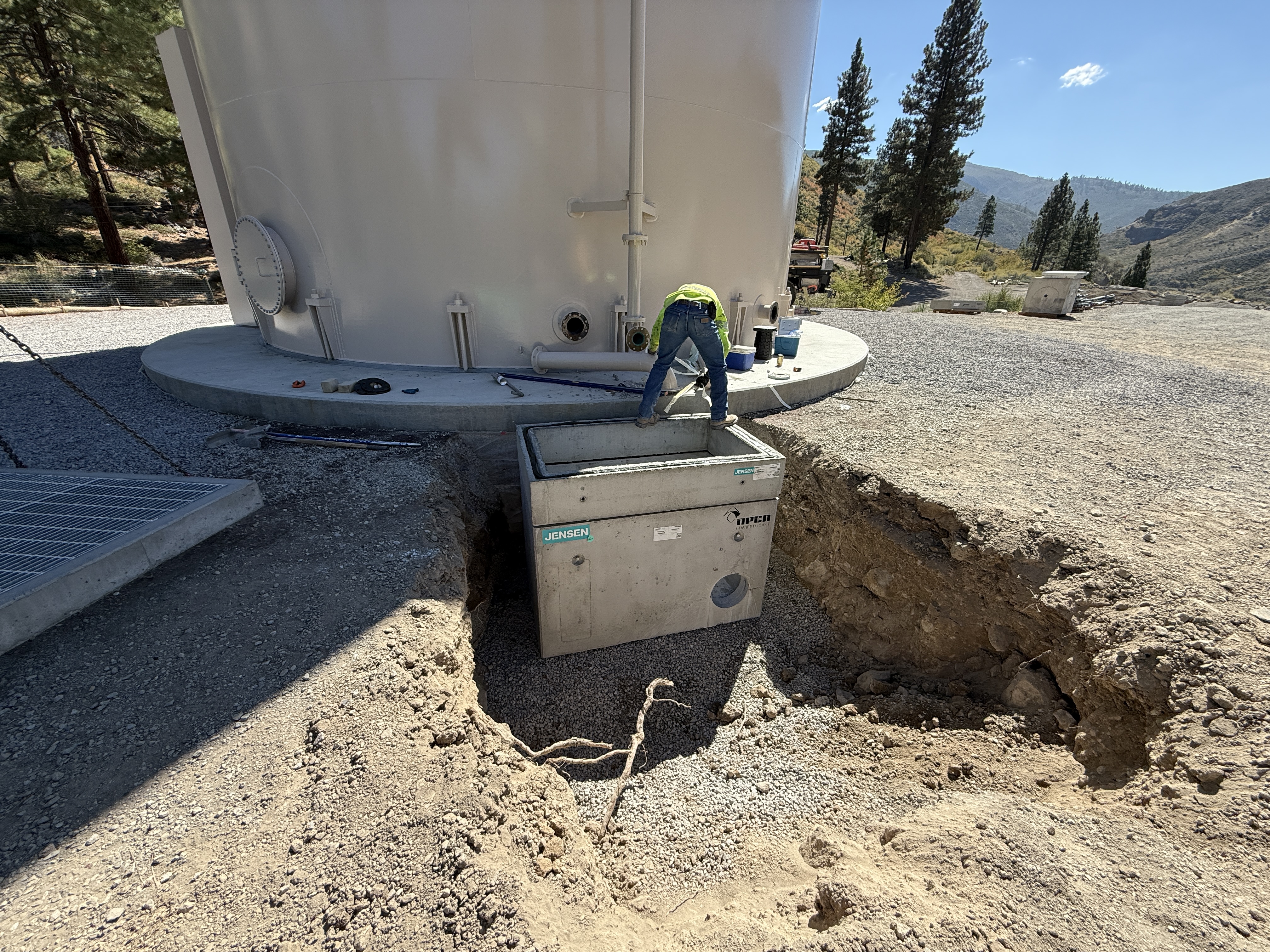 A person is working near a finished water tank, possibly performing inspection or maintenance tasks. The person is positioned above an open concrete vault with visible concrete and pipes. There is a significant open trench next to the vault, and the surrounding area is compacted gravel. Trees and mountainous terrain are visible in the background.