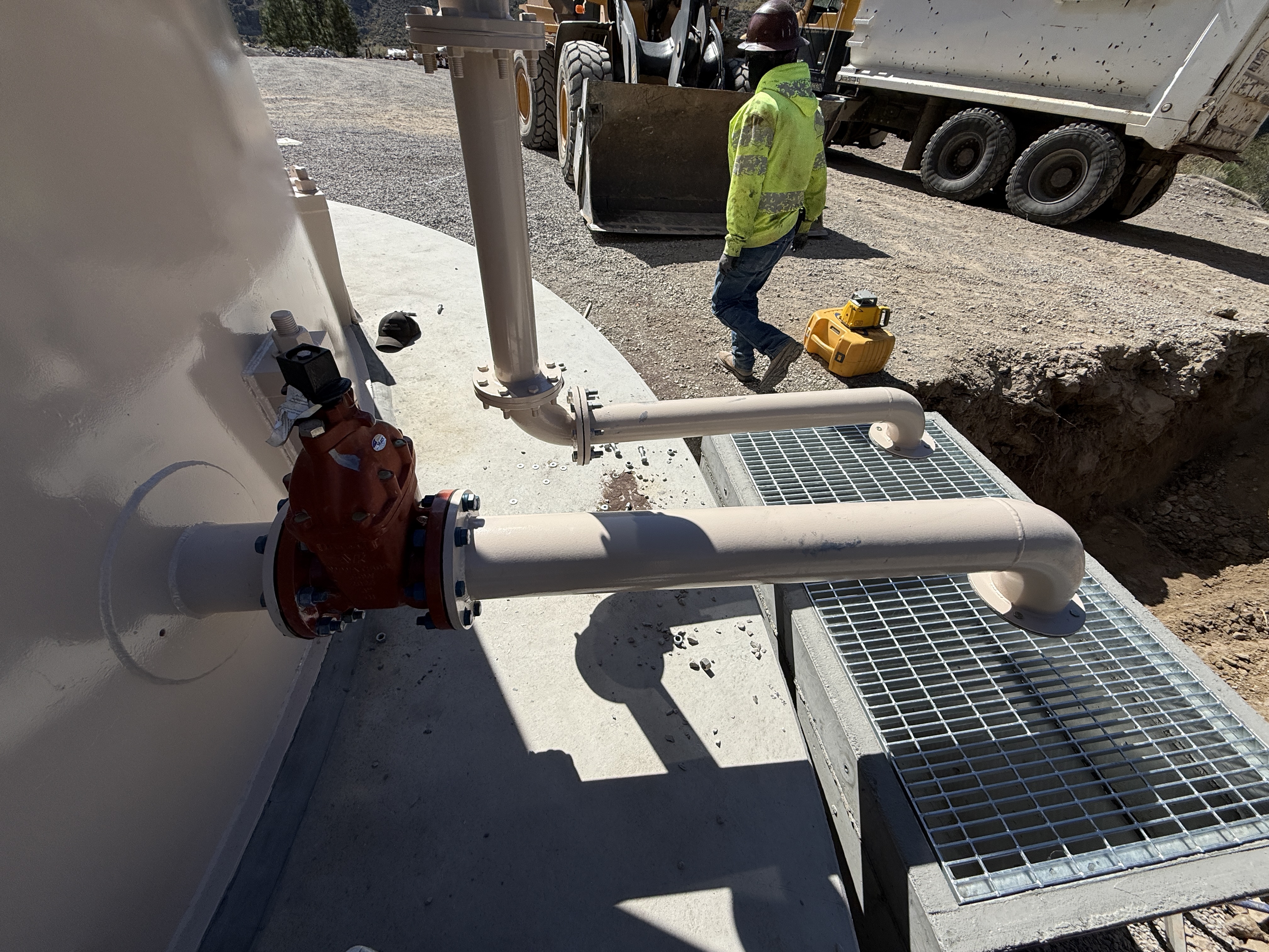 The image displays a set of pipes extending from a finished water tank with a visible valve assembly. A worker in PPE is nearby, and a loader is positioned in the background, suggesting ongoing site work. The ground surface is a mix of gravel and dirt. Lighting conditions appear bright with shadows indicating direct sunlight.