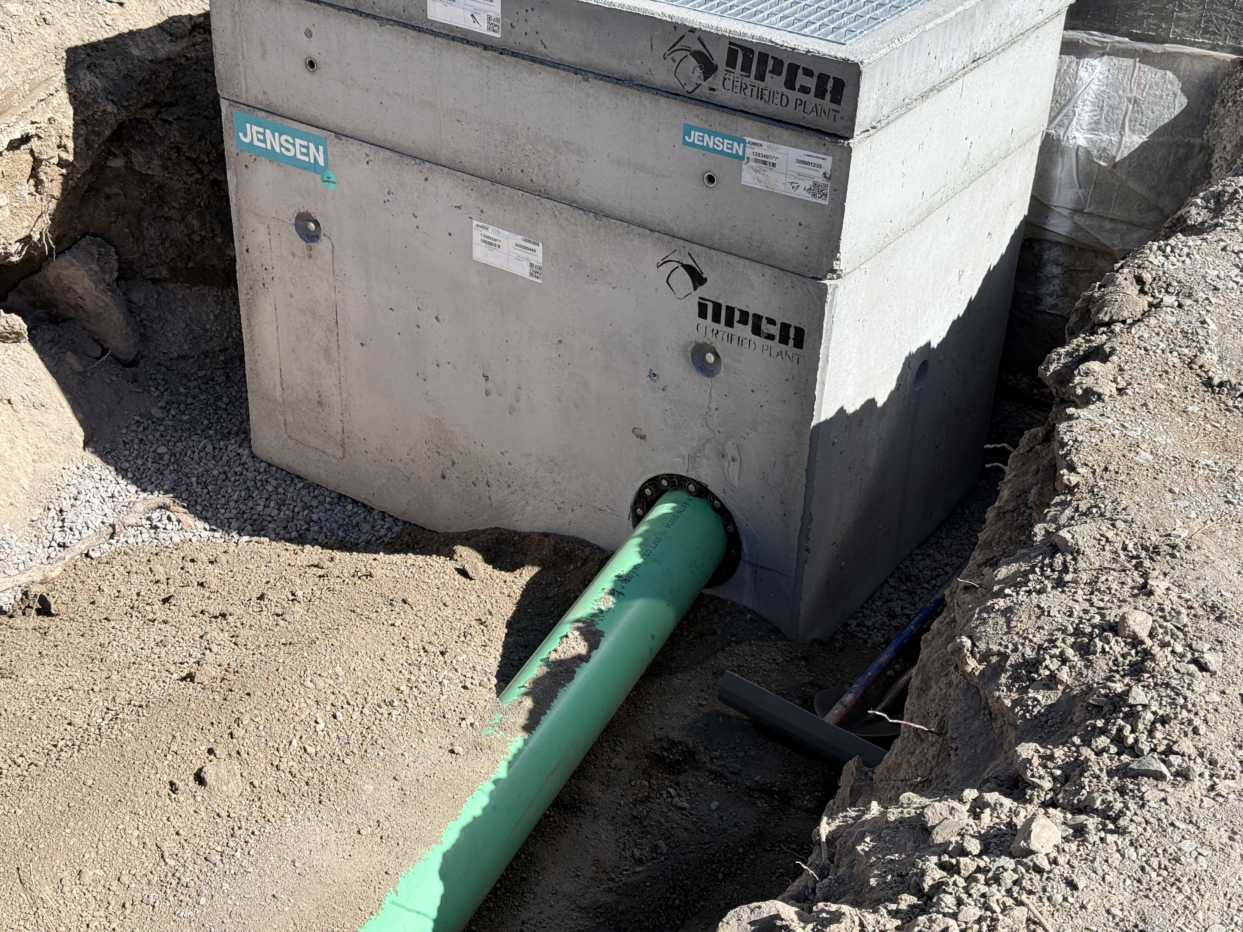 A concrete structure is partially buried in the ground with a green pipe entering it at the lower section. The structure has labels including 'Jensen' and 'NPCA Certified Plant'. The surrounding area appears to be unpaved soil, with some gravel visible at the base of the structure. No active installation work is visibly happening at the moment.
