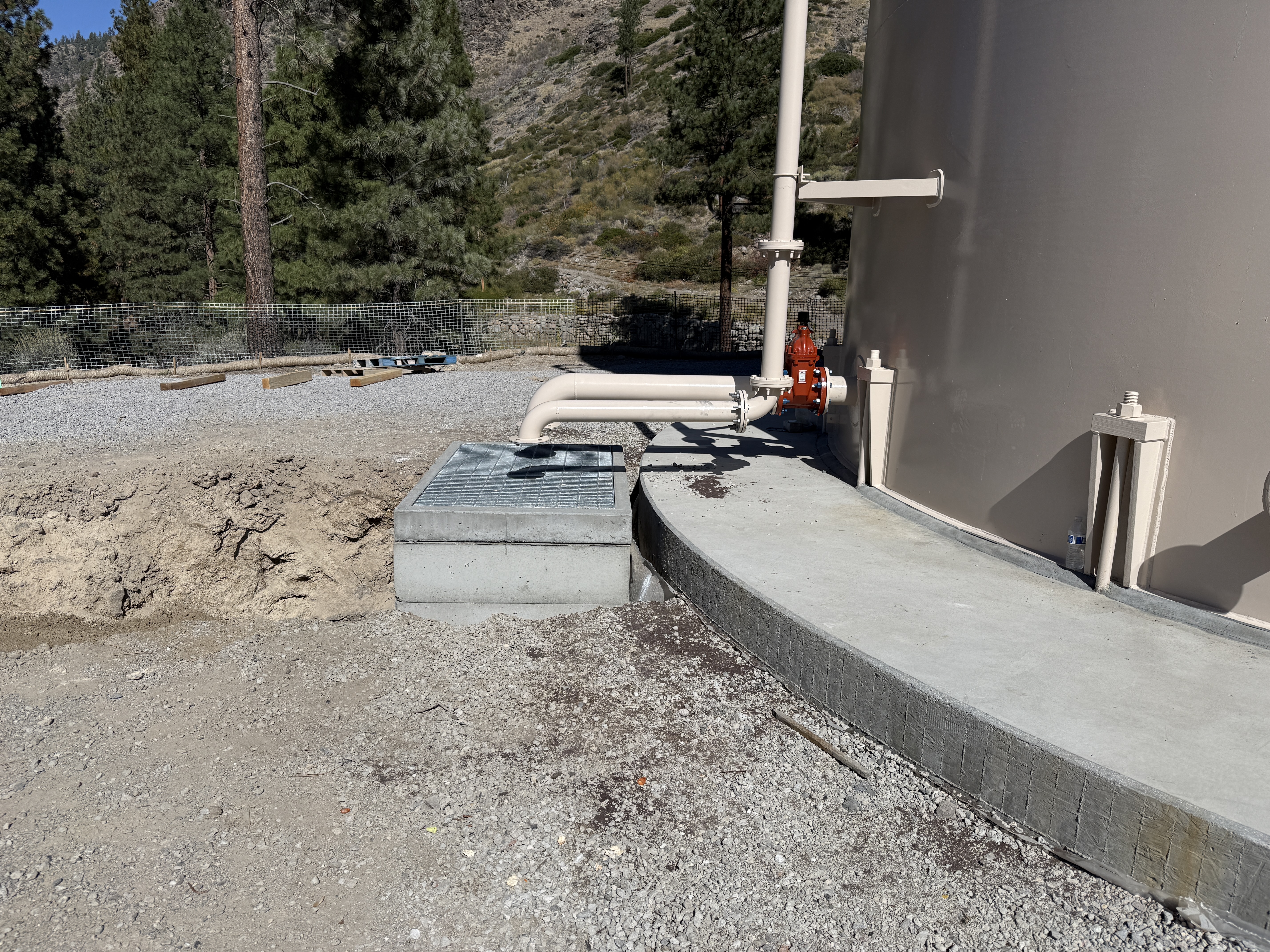 The image displays a large finished water tank with a pipe connected to it, along with a nearby concrete encasement possibly housing utilities or valves. The surroundings include dug earth and a gravel surface. A valve is visible on the piping setup. The site appears clear with no workers or heavy equipment in view.