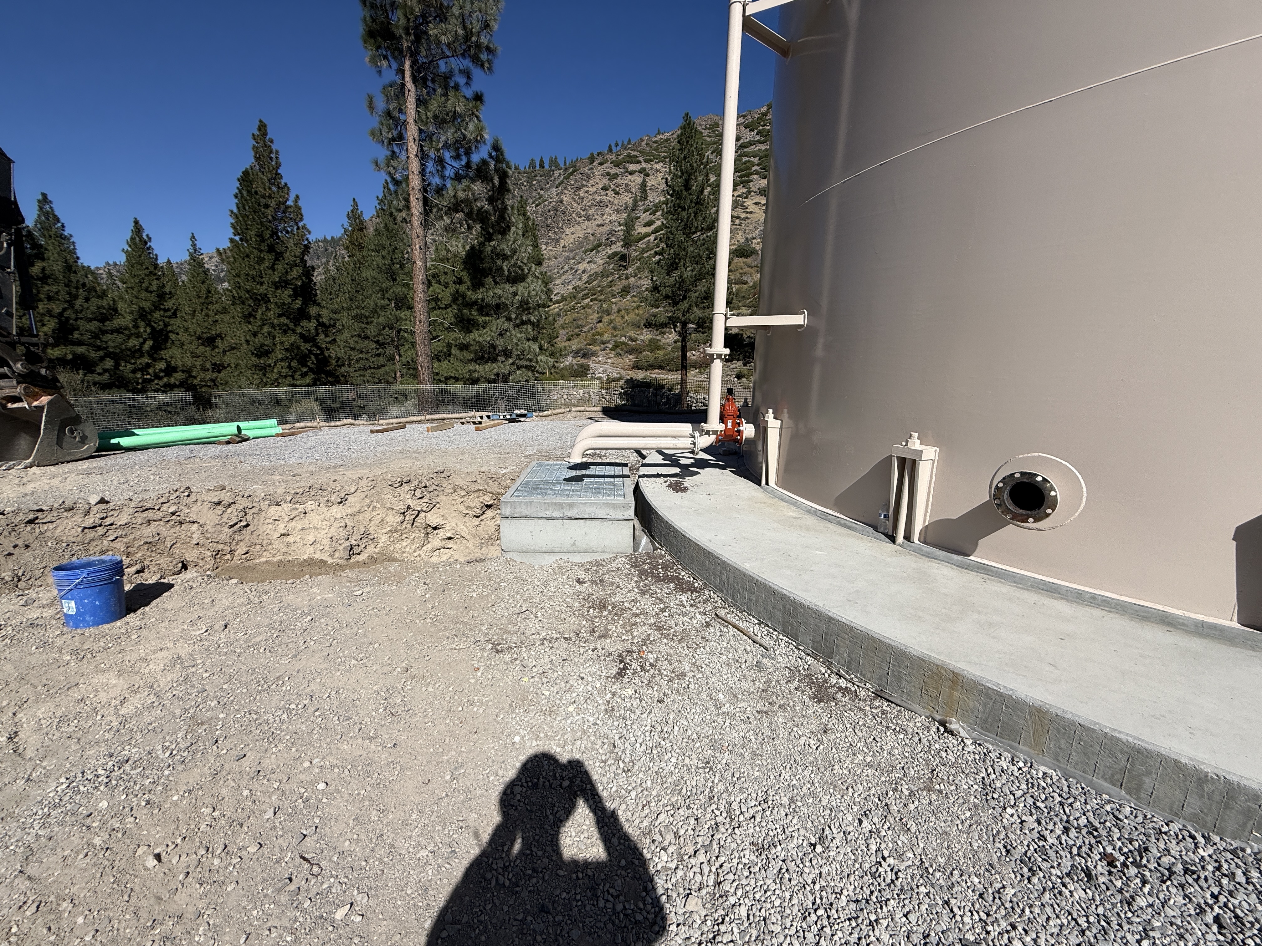 A large finished water tank is prominently featured on the right side of the image, with connected piping leading to an overflow pipe. The area surrounding the tank consists of gravel and concrete. A blue bucket is visible on the ground to the left, indicating active site work. Trees and hills serve as the backdrop.